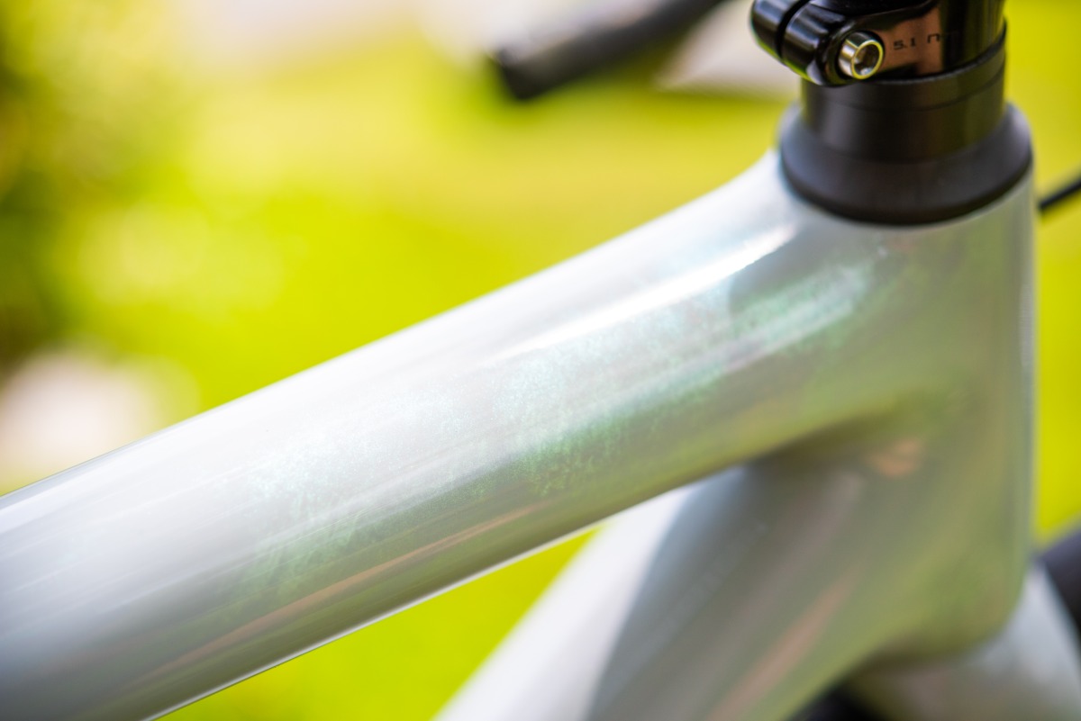 スポーツバイクの本質はなんといっても動的性能である。カラーは表層にすぎない。むしろ色に凝れば凝るほど隠蔽力の高い塗料を追加しなければならず、重ね塗りによって生じた段差を埋めるためにクリアを分厚く吹かねばならず、ときには最軽量カラーに比べて100gも重くなってしまう。だからカタログ重量の十数gの違いに一喜一憂してもしょうがないのだが、しかし見た目、特にカラーは商品力を大きく左右する。