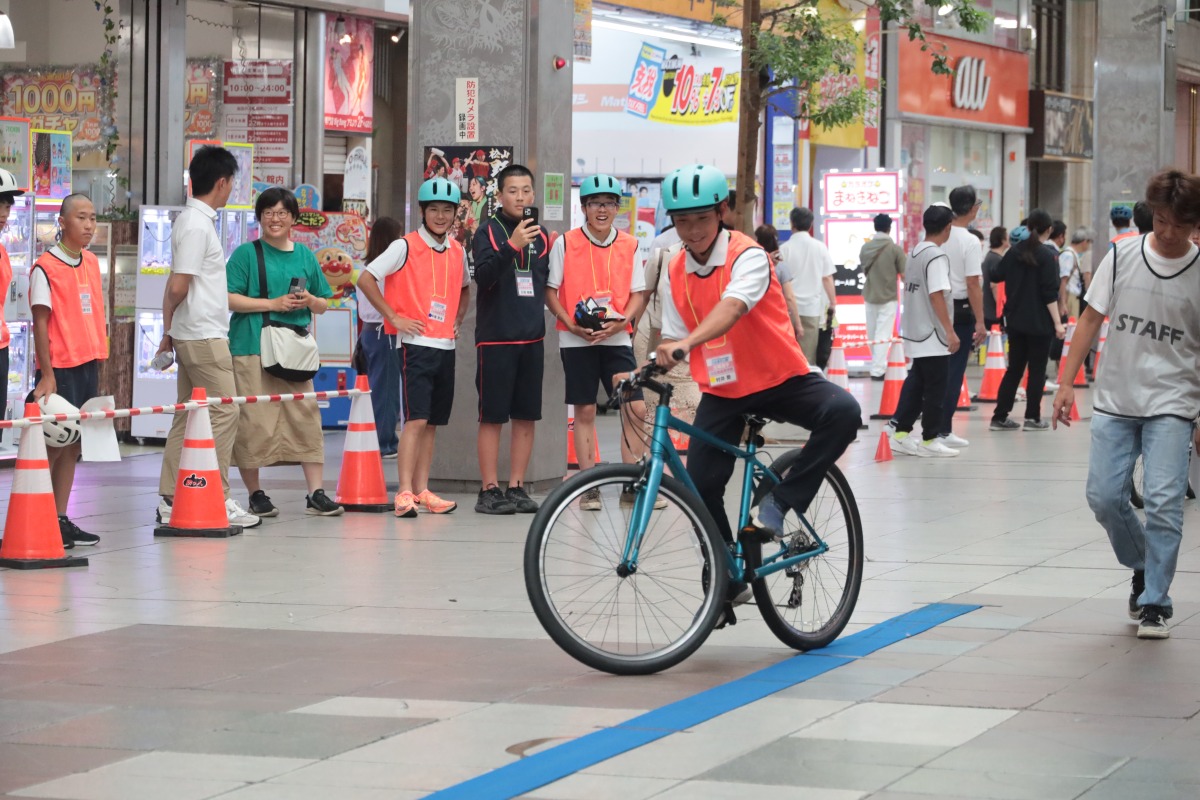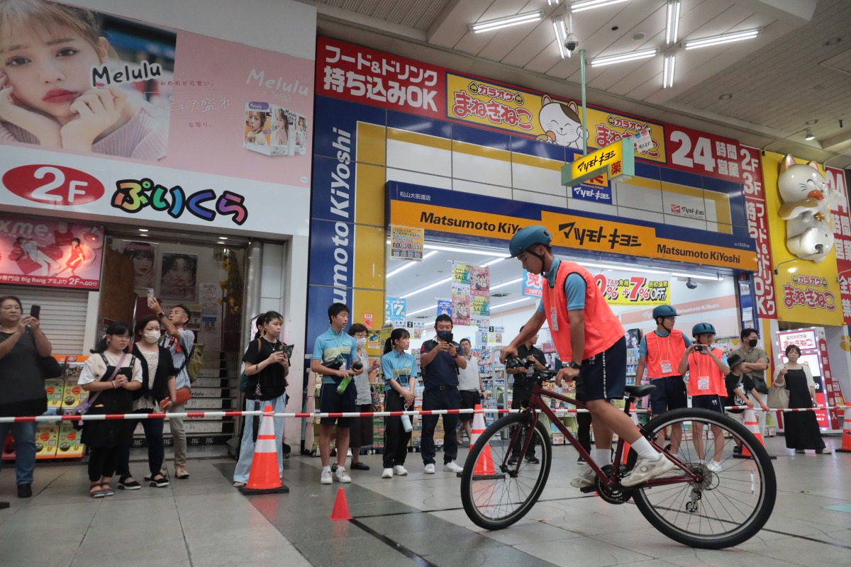 引き続き、8の字スラロームやスタンディング、30m一本橋といった競技が、松山市内の繁華街、大街道商店街で行われた。