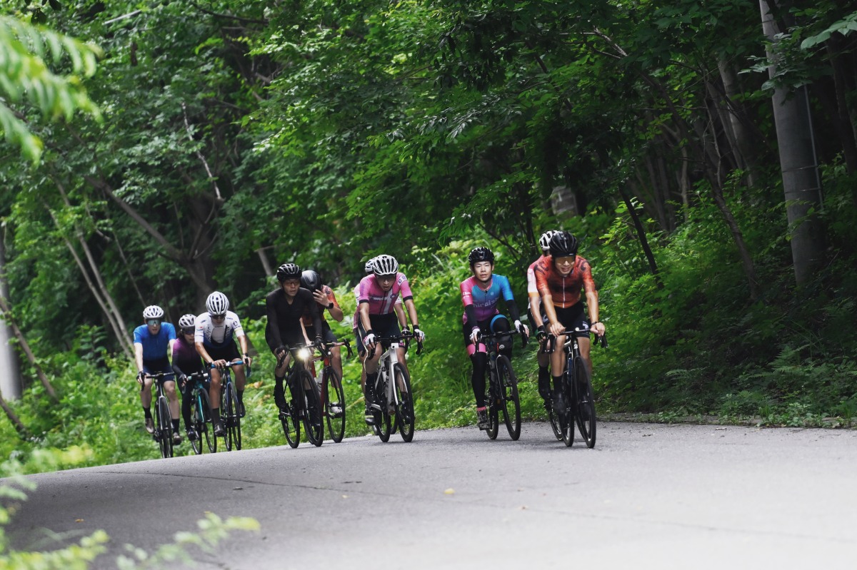 この集団はあまりにも軽快に走っており、本イベントの過酷さが伝わりづらいためキツイ表情の演技をしてもらった。やらせをしてまで撮影したはずなのに、みんなヒルクライムが好きすぎるため過酷さよりも楽しさの方が滲み出てしまっている。