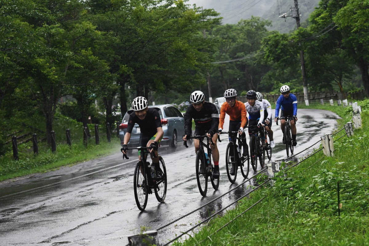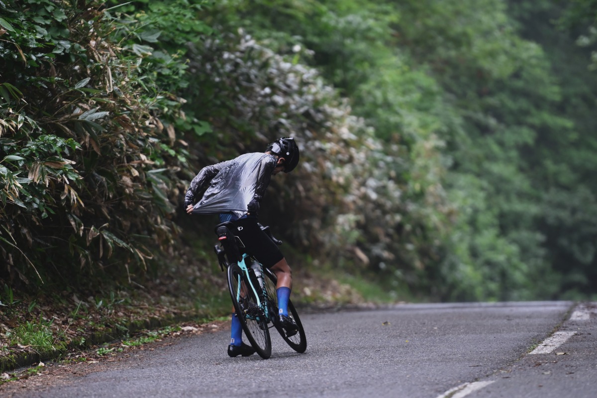 坤六峠を上り切った後は30kmを超える下りだ。雨もあり、体温の低下を防ぐケアが必須。参加者たちはレインウェアやウィンドブレイカーで調整した後に下っていった。