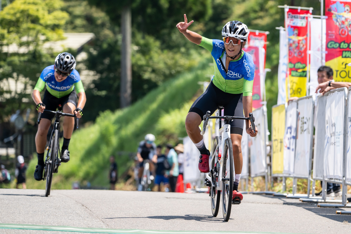 先頭集団で唯一チームメイトがいる桑原が積極的に仕掛けるも先頭集団はばらけることなく4名のまま最終盤を迎える。残り3km地点でも4名のまま先頭集団はレースを展開すると、フィニッシュラインへの上り坂で桑原が単独先行。しかし、フィニッシュライン前でチームメイトの村瀬が桑原に追いつき、そのままの勢いでステージ優勝そして個人総合リーダージャージを獲得した。2位には桑原が入る形で中国地域選抜としてはワン・ツーで第1ステージを制し、3位にはチャが、4位には松田が入る形に。メイン集団も最後は30秒差にまで先頭集団に迫る形でフィニッシュとなった。山岳賞ジャージは唯一2回共にポイントに絡んだ桑原が獲得し、スプリント賞ジャージは松田とカンが同点で個人総合時間のタイムで前に立った松田が獲得した。