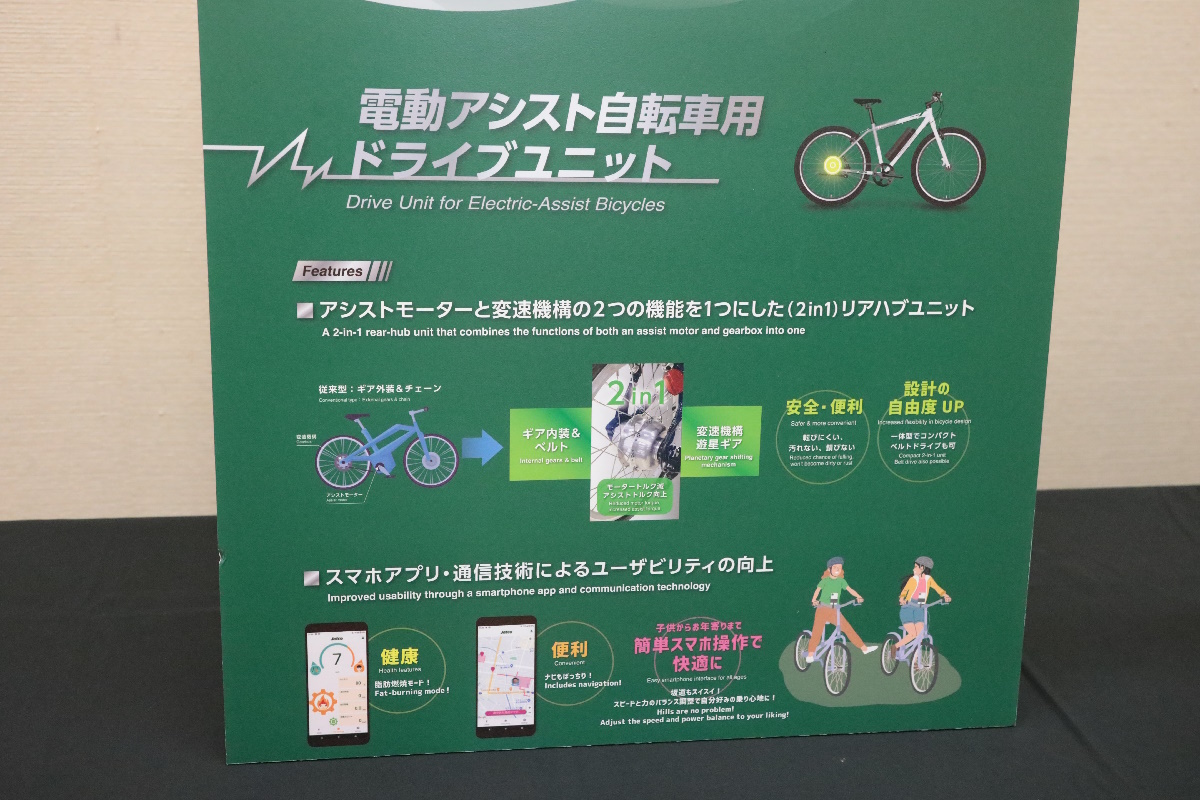 今回公開されたプロトタイプに搭載されているジヤトコ製ドライブユニットは、モーターと変速機を一体化した「2-in-1システム」を採用している。これにより、コンパクトな設計と高い自由度が実現され、様々なタイプの電動アシスト自転車に適応できる。また、自動車分野で培った高品質な技術がこのユニットにも活かされており、高い耐久性と効率性が期待される。