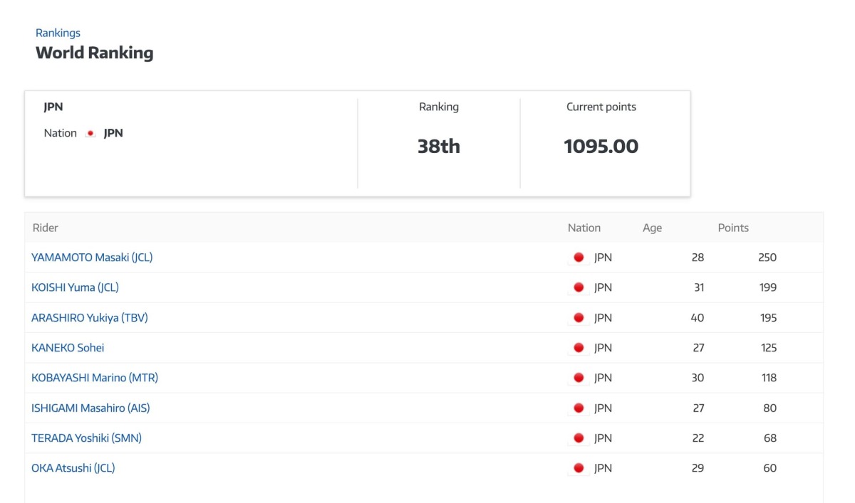 9月26日からはタイムトライアルに引き続きロードレースがスタートするが、日本の現状、ワールドランキングを頭の片隅に置きながら、世界選手権を観戦してほしい。現在、UCIナショナルランキングにおいて日本の位置は厳しい状況にある。