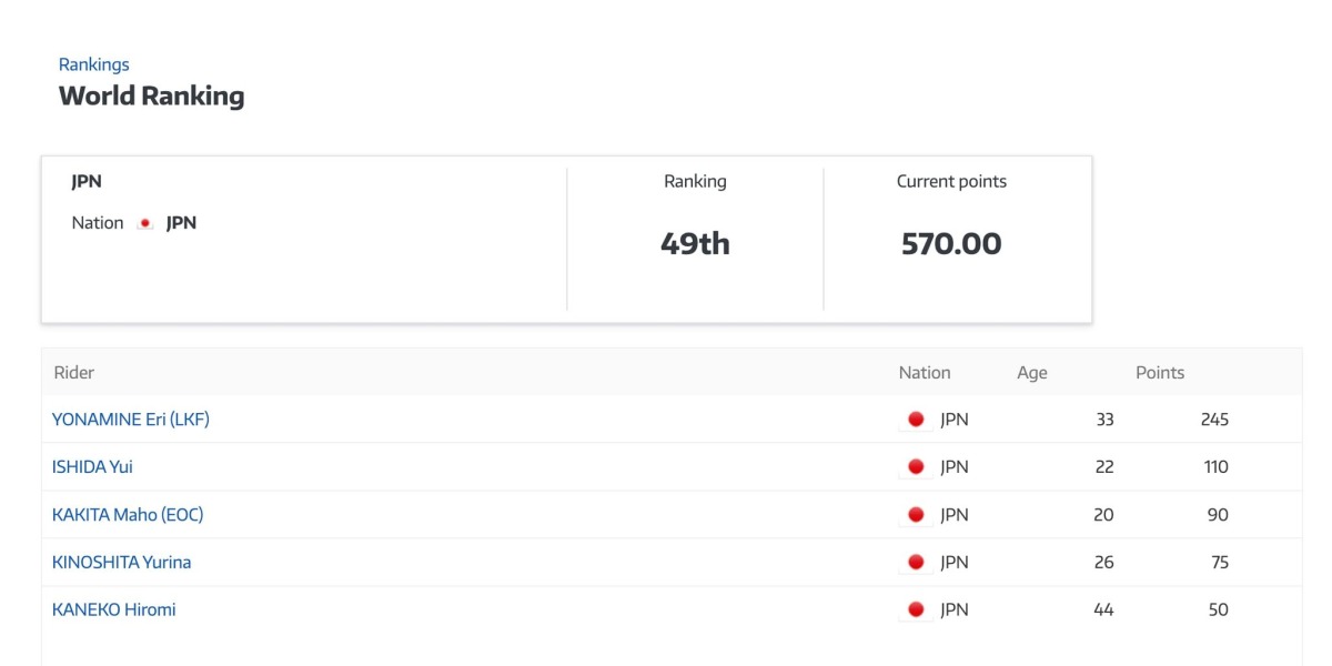 女子エリートでは49位となっており、アジア各国(中国、香港、インドネシア、タイ、カザフスタン、韓国)に大きく遅れをとっている。特に、2024年アジア選手権に日本はナショナルチームを派遣できなかった影響が大きく、ランキングが低迷している。現在のポイントだと、ロス五輪出場枠を獲得するのは絶望的である。