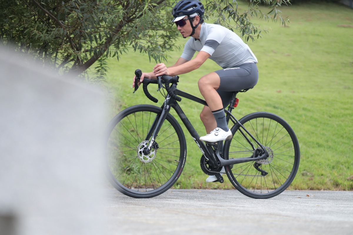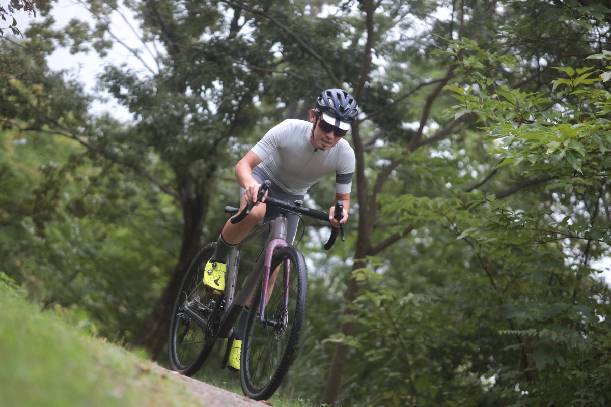 最後に、グラベルロードのブリードにも乗らせてもらった。ブリードシリーズにはカーボンフレームのブリード・アドバンスド(GRX820完成車、GRX610完成車、フレームセット)と、アルミフレームのブリード30(GRX820/610混成完成車)があるが、用意していただいたのはGRX610完成車。トーンを揃えて色相で差を付けた配色が目に心地いい。