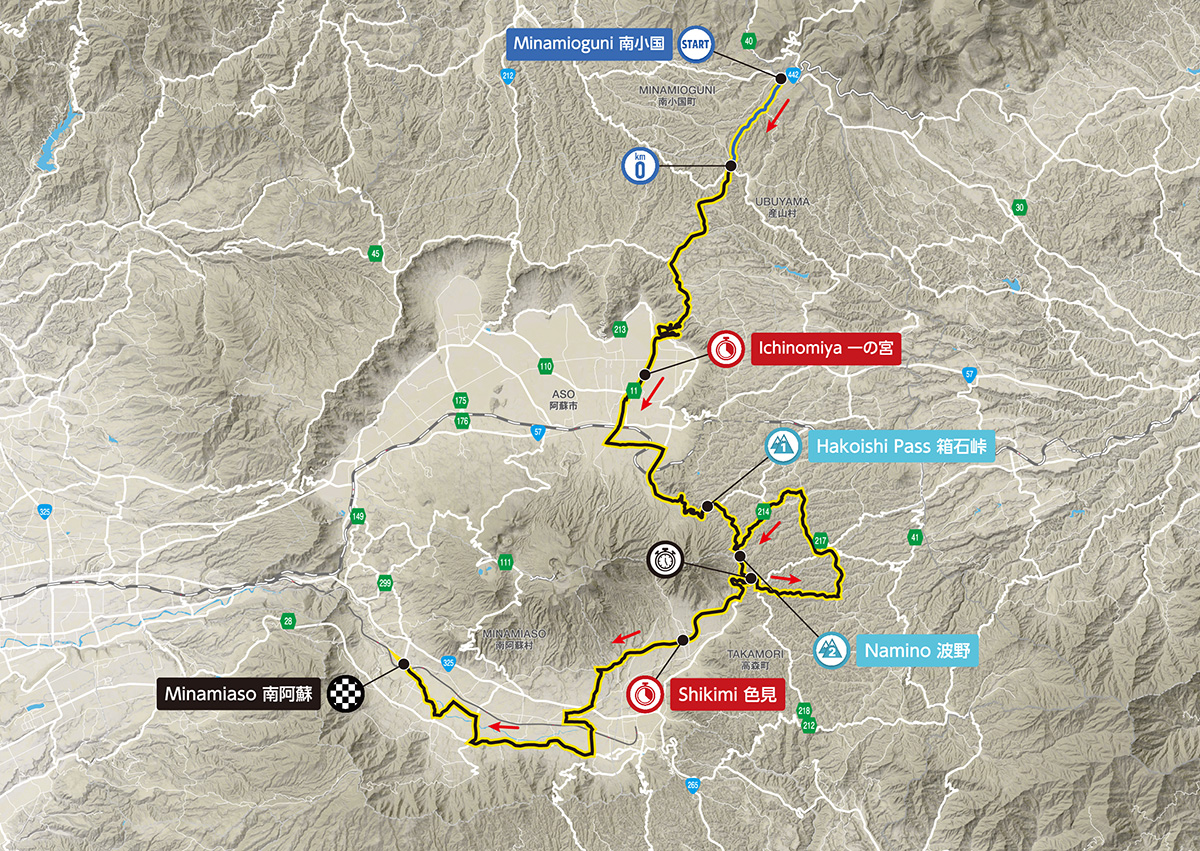 世界最大級のカルデラと草原をめぐる絶景コース。熊本地震から復興した阿蘇神社を見ながら進むと、いよいよ雄大な阿蘇の山々へ。1級山岳の箱石峠を上ったのち、2級山岳・波野を含む小周回を3周。レース終盤は南阿蘇村のフィニッシュラインを目指して突き進む。今大会のクイーンステージとの声も高い。