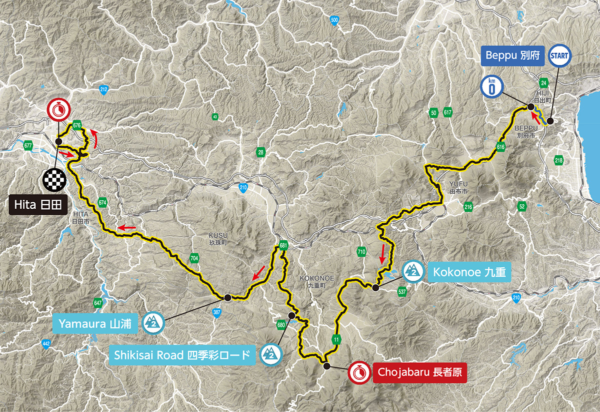 マイナビ ツール・ド・九州2024の本戦がこの日から始まる。ステージレース初日から山岳地帯を走る難易度の高いルートが設定された。別府市の立命館アジア太平洋大学をスタートし、湯布院温泉を通過。日本での有数のワインディングロードであるやまなみハイウェイでレースは動くか。コース内には3カ所の山岳ポイント(KOM)が置かれ、山岳賞争いも注目。レース終盤は日田市街地の周回コースを2周しフィニッシュに達する。