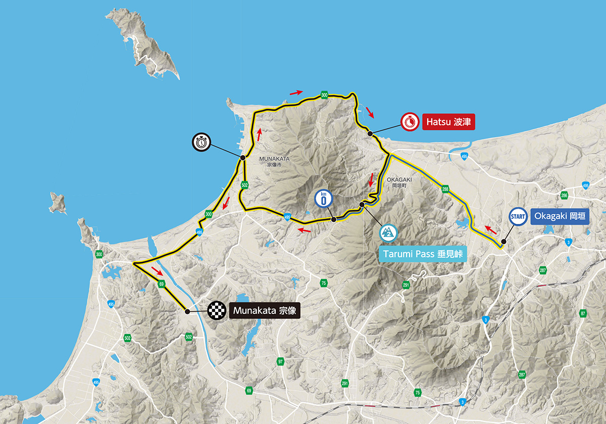 玄界灘沿いのシーサイドルートと2級山岳・垂水峠を上る14kmの周回コースを9周。前日までに個人総合争いをはじめとする各賞争いが僅差だと、この周回コースでの争いが一層激しさを増す。9回目の垂見峠通過後、最終盤は針路を変えてフィニッシュ地・宗像へ。3日間の戦いのフィナーレを迎える。
