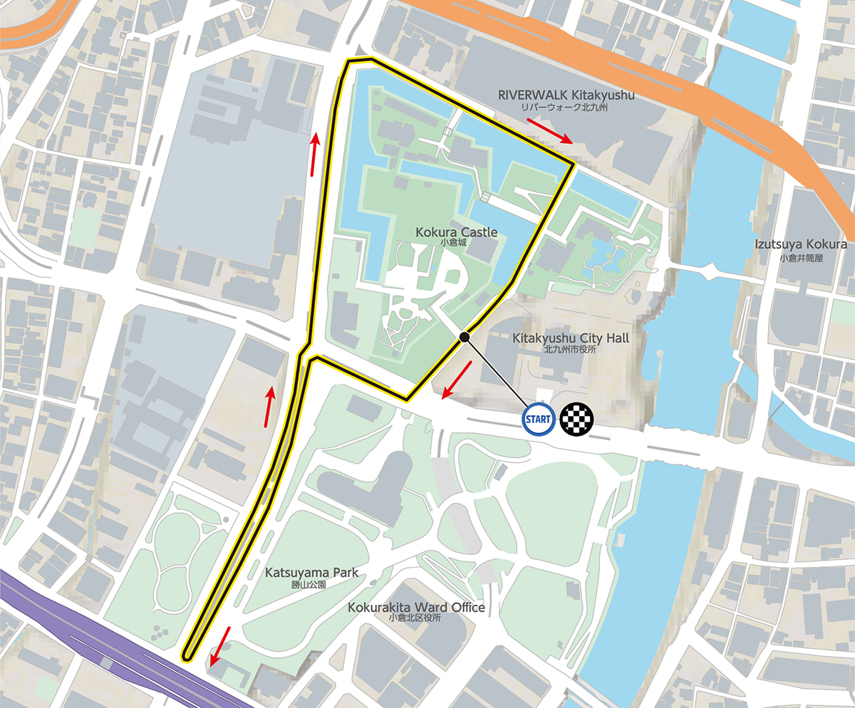 細川忠興公が築城した小倉城をめぐる1.8kmのコースを25周回。約45kmで争われるレースはおおよそ1時間程度で決着。時速70km近くまで加速するスプリント勝負は絶対に見逃せない。