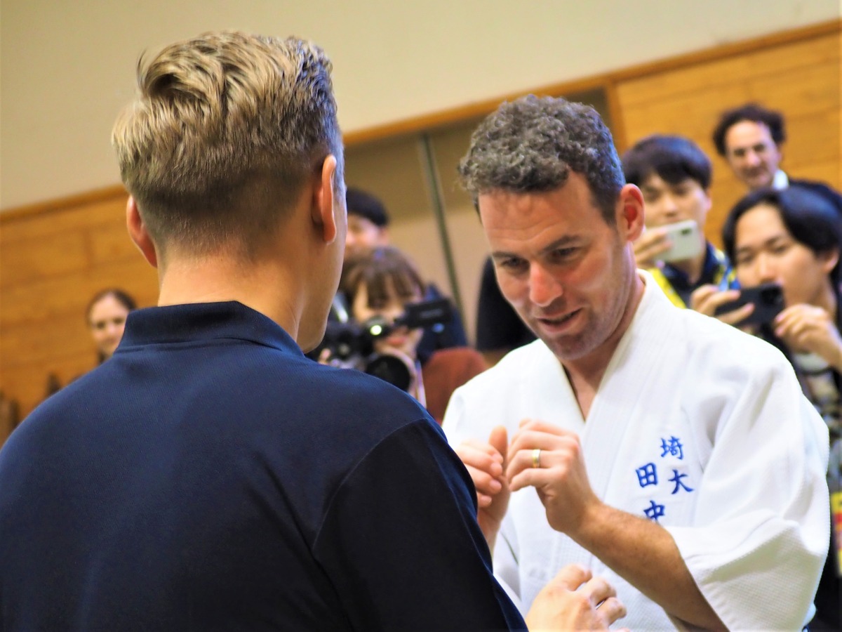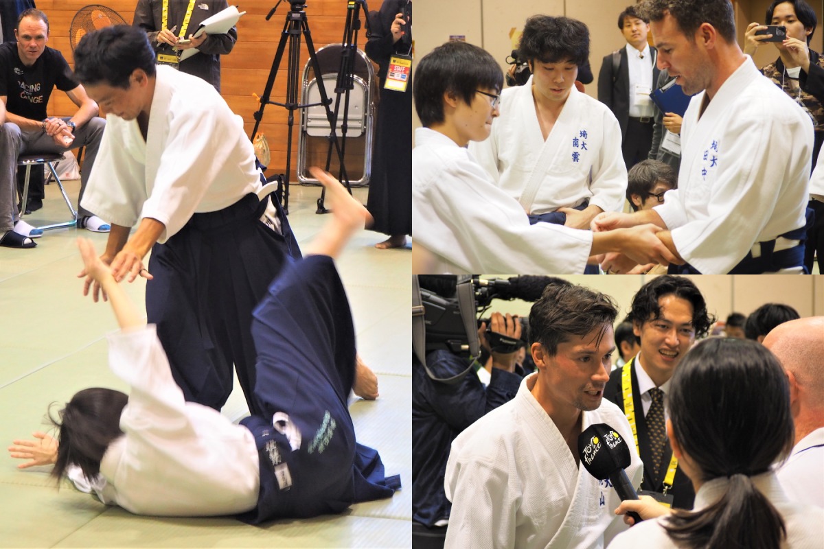 合気道を体験するため道着に着替えたのは新城、ログリッチ、カヴェンディッシュの3名。合気道部員の模範演技を見た後、簡単な技を指導してもらい、さっそく披露した。