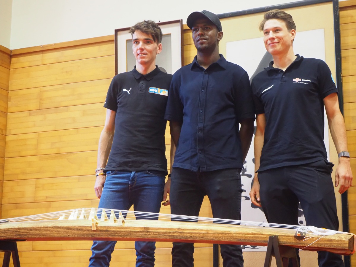 続いての体験は琴。埼玉大学邦楽部琴吹会による素敵な演奏に耳を傾けた後は、バルデ、ギルマイ、フィリプセンの3名が赤じゅうたんの上で琴を初体験! 3名はごくわずかな練習を経て課題曲(?)である『オーシャンゼリゼ』を披露。