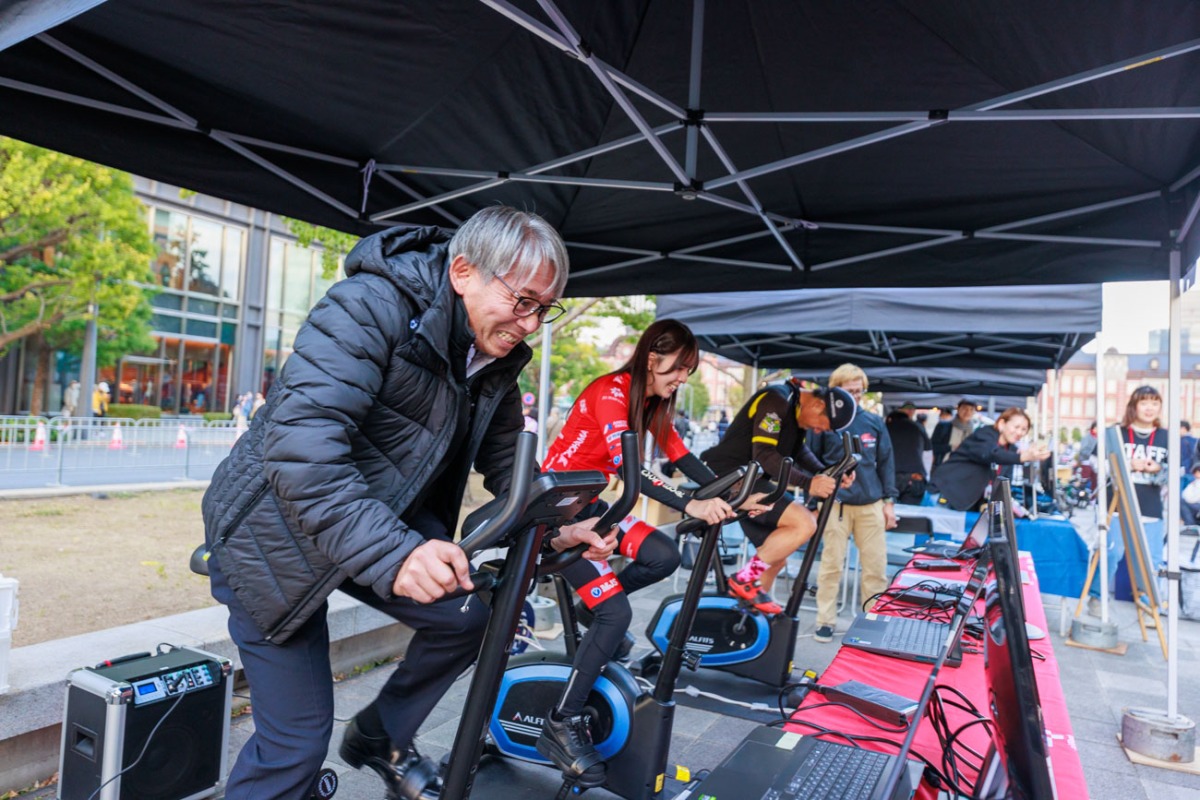 バーチャルサイクリング「VRoad」の体験会では、オリンピックで使用された伊豆ベロドロームを仮想空間で走行できるコンテンツが登場。