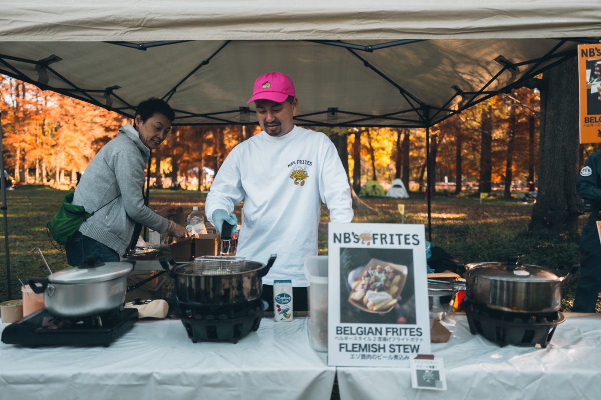 雑誌バイシクルクラブはじめ、多くのメディアで活躍するフォトグラファーのNBこと田辺信彦さん。現在は北海道の中川町を拠点に活動する、NB’sフリッツとしてフライドポテトと鹿肉のビール煮込みを販売。こちらはバイクロア名物といえるだろう。連日完売と人気を博していた。