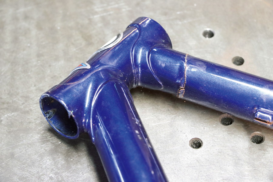 アルミフレームはクラックに要注意。特にヘッドパーツが圧入されているものは、クラックが入っているかいずれクラックが入る運命という。TIG溶接で補修できるが、塗り替えが必要。
