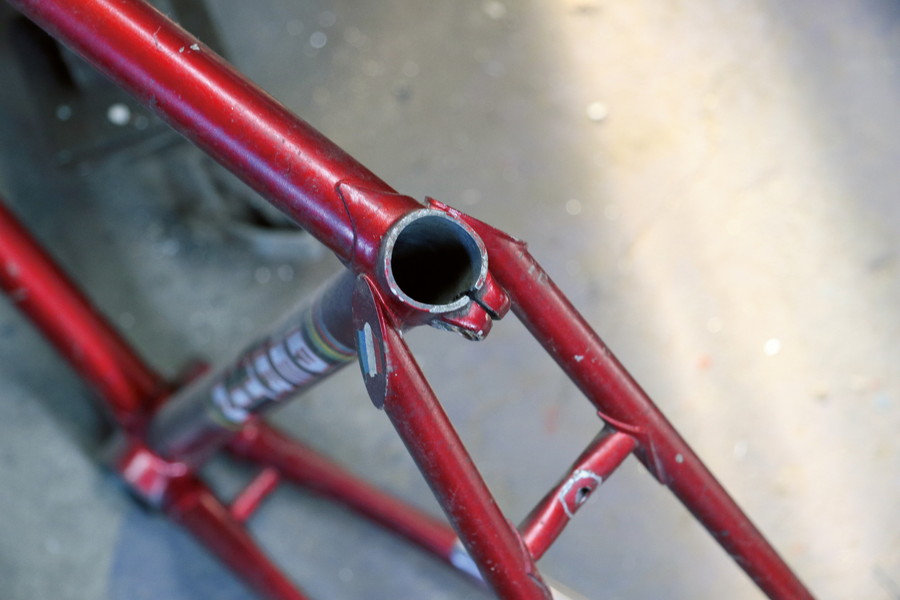 量産フレームに多いプレスラグのシート部。シートクランプの過度の締め付けでつぶれてしまっている。つぶれをこじ開いてロウを盛って修正できるが、塗り替えが必要となる。