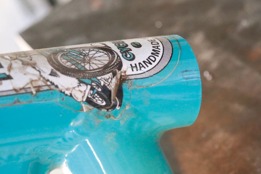 アルミフレームはクラックに要注意。特にヘッドパーツが圧入されているものは、クラックが入っているかいずれクラックが入る運命という。TIG溶接で補修できるが、塗り替えが必要。
