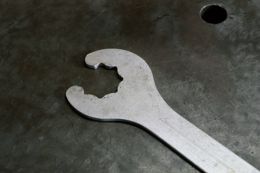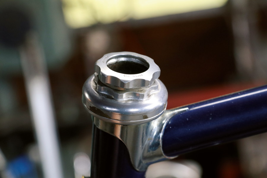 今回持ち込んだフレームにあった例だが、特殊なヘッドパーツが使われている。70後半〜80年代にシマノで採用されていたもので、専用のヘッドワン外しが必要となる。一応32㎜で外せないこともないが、ナットをつぶしてしまう。工房に当時の工具があったので高いトルクで締まっていたナットをなんとか外せた。