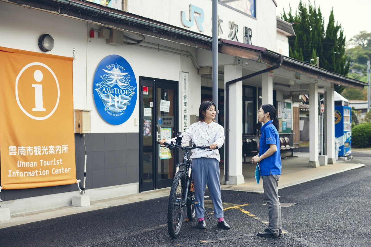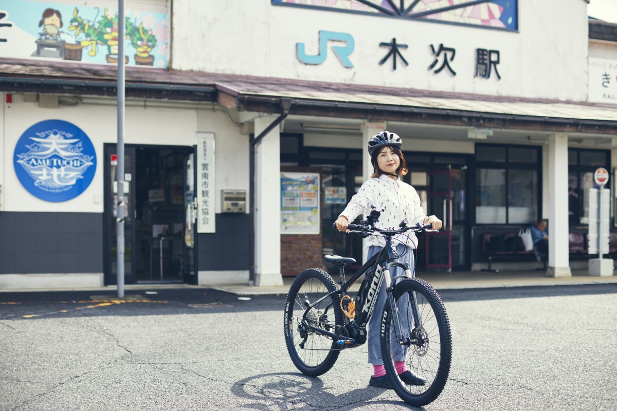 木次(きすき)駅内にある「雲南市観光案内所」で電動マウンテンバイクをレンタルしてスタート。サイズは2タイプあり、Sサイズは対応身長152cm〜で、小柄の方も乗りやすい。レンタル料金は2時間1,500円、4時間2,000円、6時間2,500円とリーズナブルなのもうれしい。
