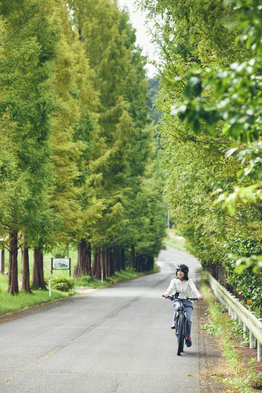 ワイナリー付近で迎えてくれるのはメタセコイアの並木道。坂道も少しあるけれど、電動アシスト付きマウンテンバイクのパワーで難なく登っていこう。ブドウ畑を眺めながら並木道を走ると、周囲の山々と調和して佇むワイナリーが見えてくる。