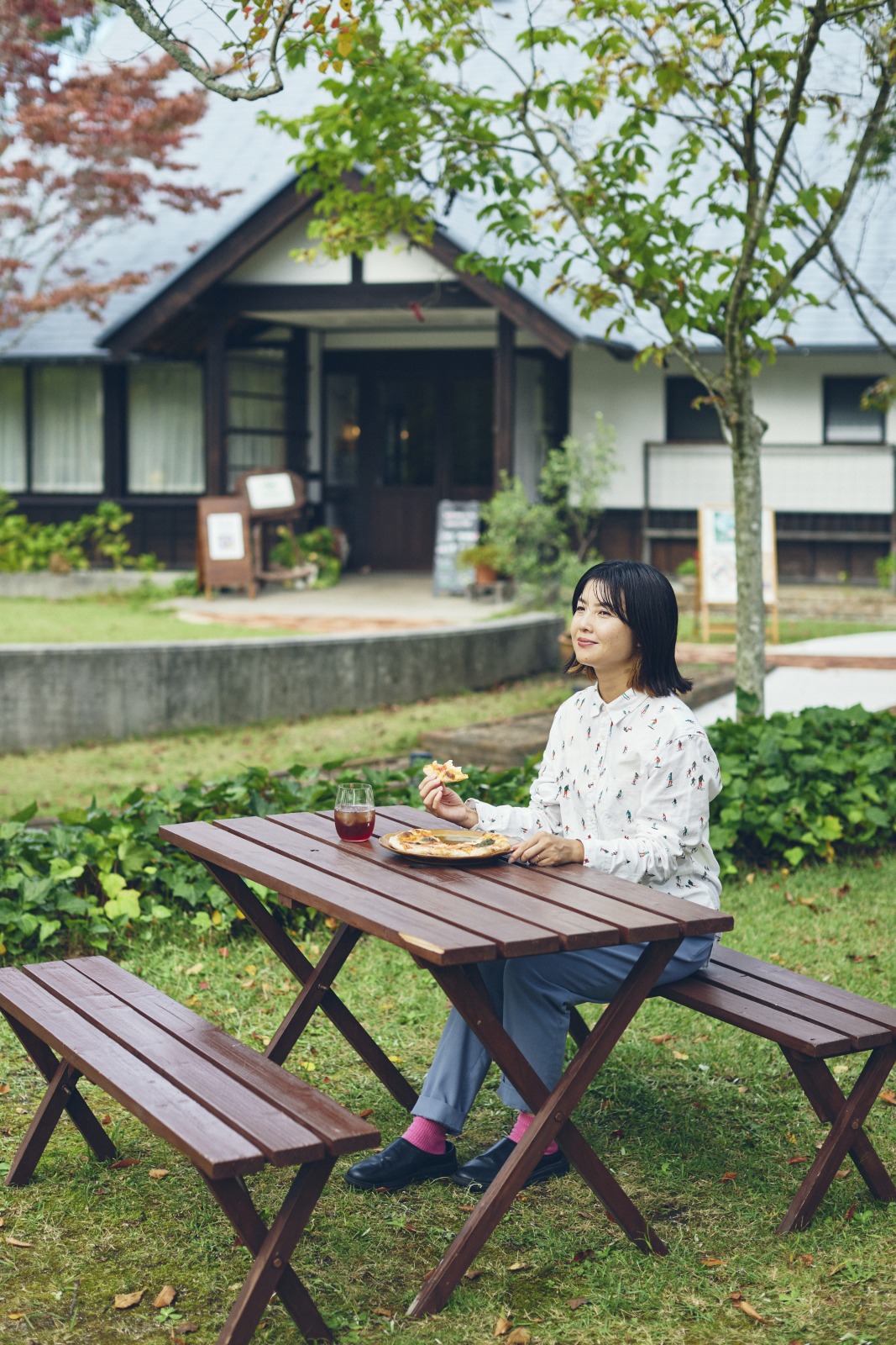芝生の上で食事できるように、とスタートしたワイナリー併設のガーデンカフェでは、地元の食材をふんだんに使ったメニューを10時〜16時30分に提供(冬季休業あり)。オーダーを受けてから焼き上げるピザは雲南市「木次乳業」のチーズを使用。季節替わりの食事メニューやパンケーキ、ジェラートなどのスイーツ、ぶどうジュースなどラインナップも充実。オープンエアーの開放感とともに味わおう。