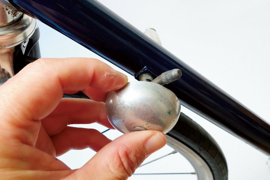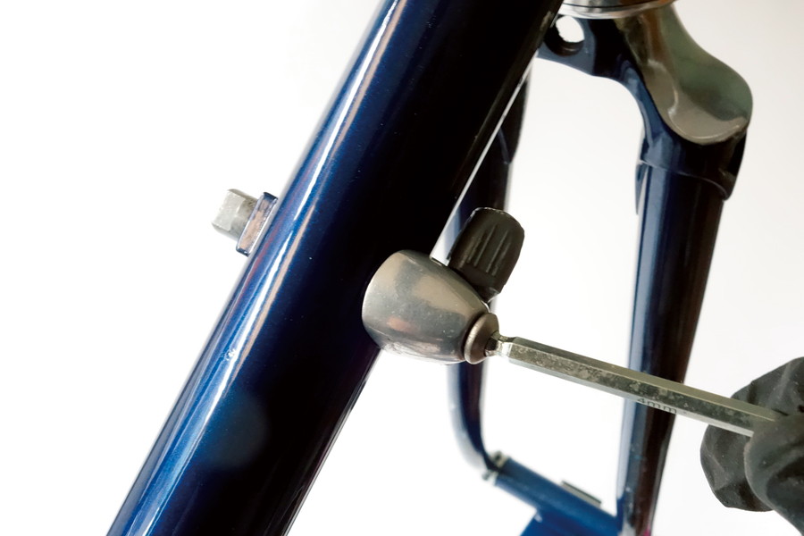 レバー用の台座があるが、Wレバーは使わない。カンパニョーロタイプの台座に合うアウターストッパーを装着する。この手のパーツをショップで見ることも少なくなったが、リペアパーツとして入手できる。今回フロントメカは使わないので、左側の台座にはアルミのベルを装着する。この手のスタンダードなベルのバンド部分に付くネジ径がレバー台座と同じだ。使われない台座のモヤモヤを解消。