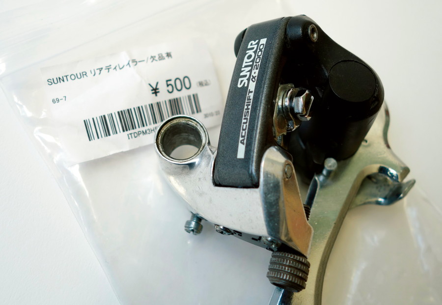 オールドMTBブームで、最近またリスペクトされる往年の国産メカ、サンツアー。あれっシフターが9速でスプロケットが8速?と気づいた人は鋭い。アキューシフト(サンツアーのインデックス規格)対応のリアメカは、シマノ9速シフターで引くとシマノ8速でインデックスするいう噂がある。今回そんな都市伝説を検証。うまくいけば、サンツアーを使うことで9→8コンバートできる。メカはα2000、チープなメカはマニアにも人気がなく新古品でたまに見るやつだ。