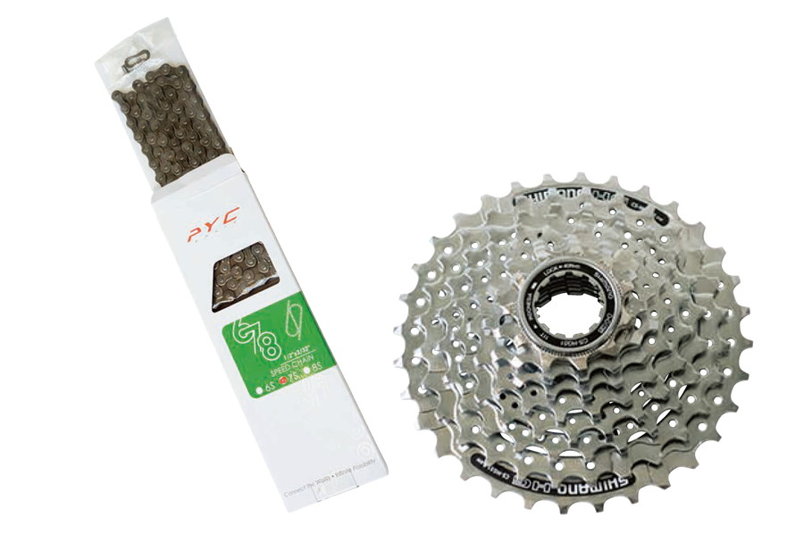 8速だとスプロケット1枚の厚みもありロングライフ。シマノ・CS-HG51で2684円。かつ8速なら6〜8速対応の一般車用チェーンが使える。モノタロウのレギュラーチェーン(台湾製のPYC)は648円だ。厚みがあり駆動効率の良さは踏んで感じられる。