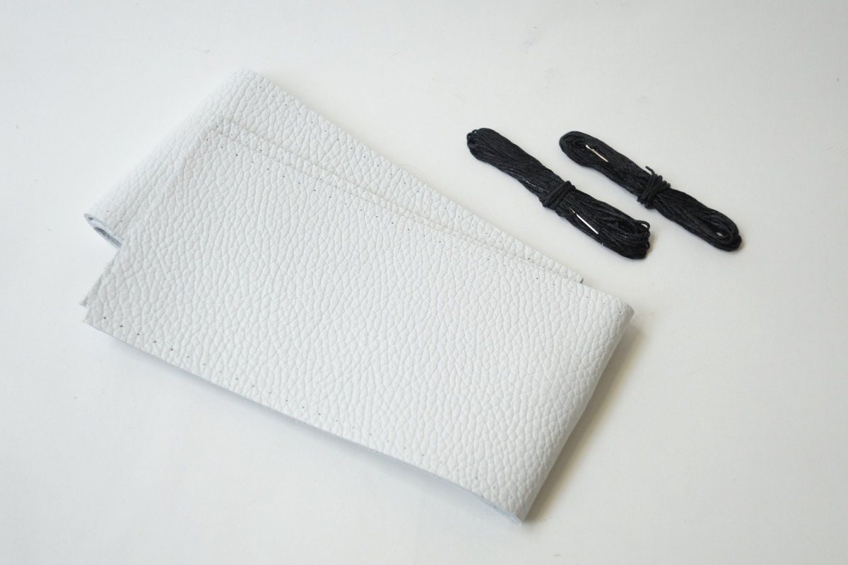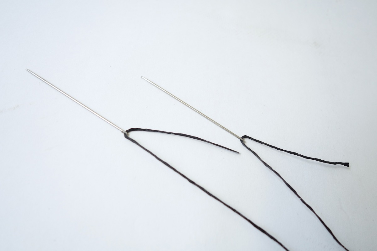 まず付属の針2本をロウ引きの糸の両端に入れる。これを革の穴を使って靴紐を編むように通していく。
