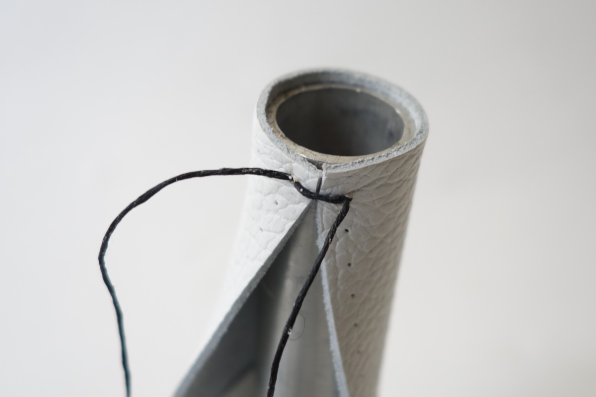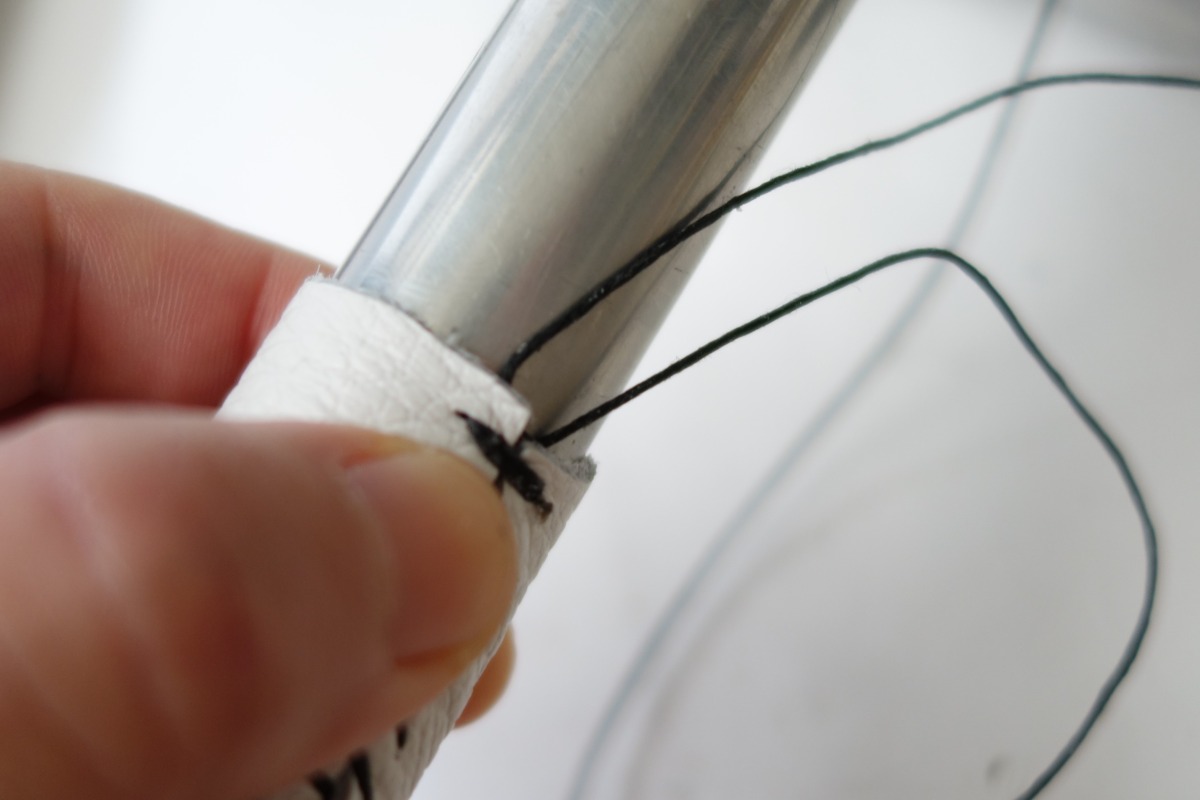 最後は、2重に糸を巻いて、革の下になるところで結んで糸を切って完了! 作業時間は、頑張っても片側半日ってところだろう。