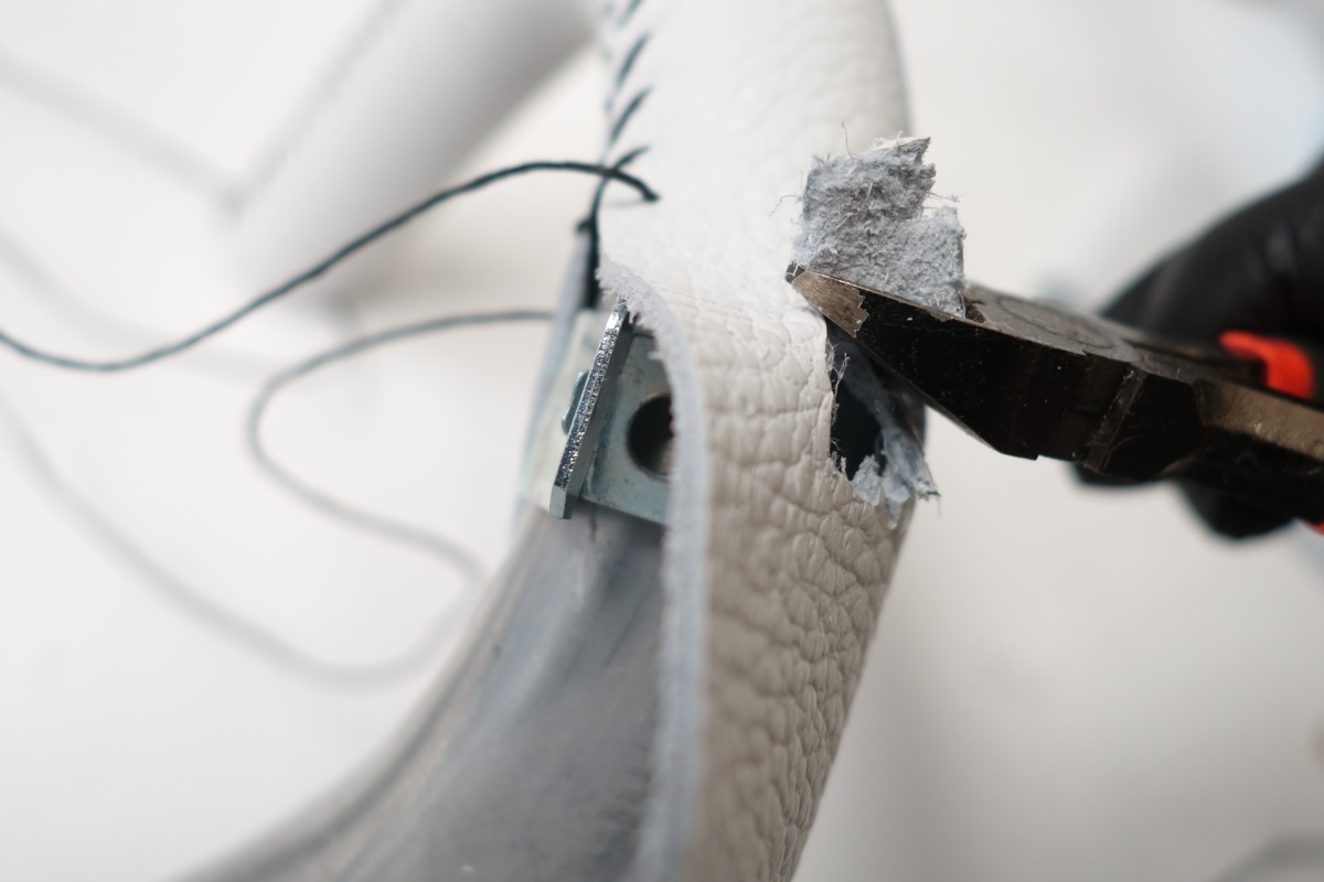 鬼門は、ブレーキレバーのバンド部分。ニッパーなどで、バンドが出るように四角い穴を開ける。革は伸びるので、小さめに切って革を動かしたい方向に切広げでいく感じで調整したほうがよさそう。ここは、ぜったいに失敗できない。失敗しない女医になったつもりで切る。