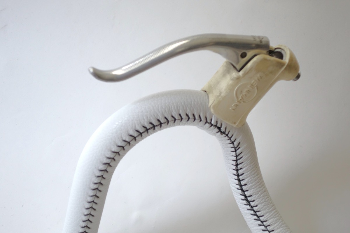 色は三色、ホワイトとブラック、ブラウン。糸はホワイトかブラックを選べる。今回はホワイトの革に、見えやすいブラックの糸を使用。個人的に自分が持っているもっともお宝な英国ヴィンテージ、GBのハンドルに装着することにした。ちなみに、大槻輪業社で縫い上げてもらうと工賃は、1万3000円。けっこうするなあ、と思うのは作業を体験してないから。