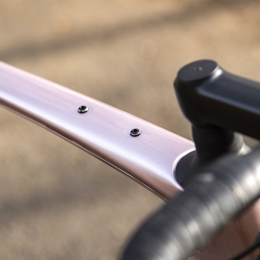 トップチューブにマウントボルトを配置し、トップチューブバッグが固定できる。さらにダウンチューブにもボトルケージマウントがあり、ロングライドを想定したバイクであることがうかがえる
