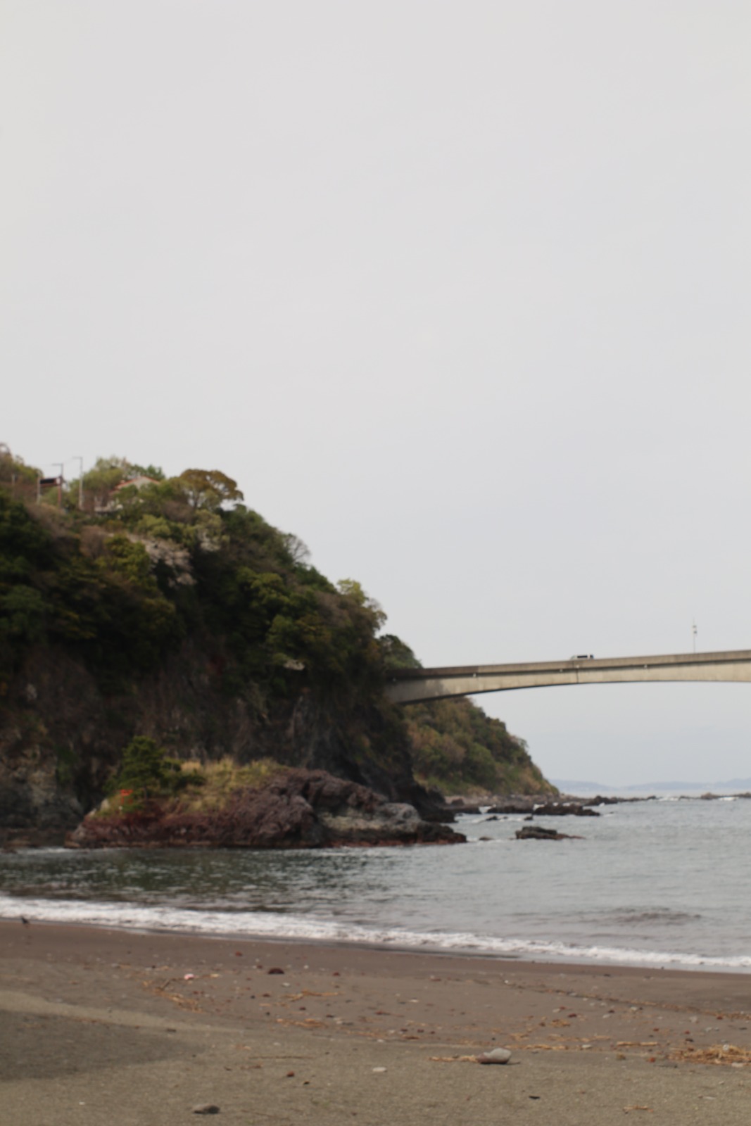 真鶴の町の北側の岩海岸のほうにやってきた。岩というけれど200mほどの砂浜が広がるエリアで、夏は海水浴客でにぎわうらしい。オフシーズンの今は静まり返っている。このあたりにしてはちょっとした平地があるエリアで、古い家が立ち並ぶが人の姿はまったくない。