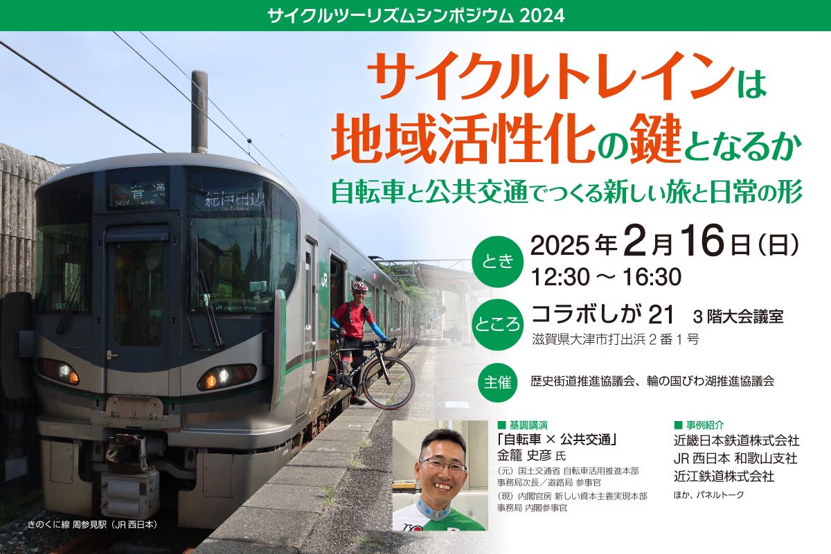 こうした背景を受け、歴史街道推進協議会と輪の国びわ湖推進協議会は、2月16日(日)に滋賀県大津市で「サイクルツーリズムシンポジウム2024」を開催する。テーマは「サイクルトレインは地域活性化の鍵となるか 自転車と公共交通でつくる新しい旅と日常の形」。