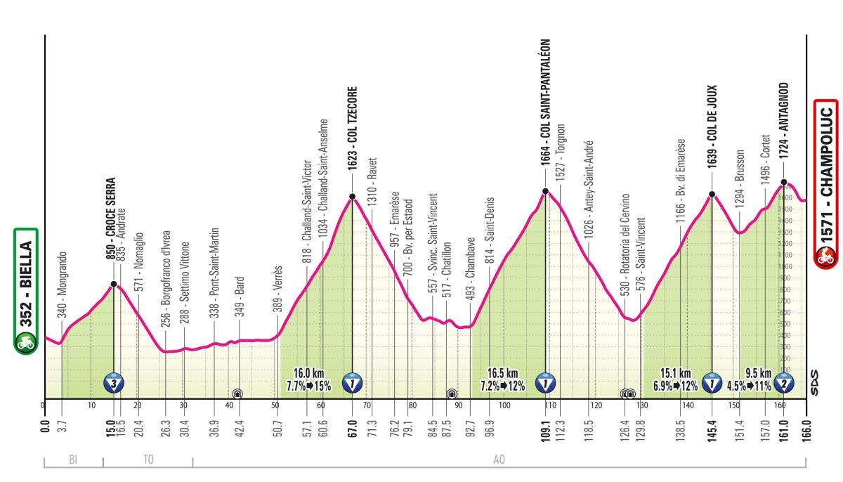第19ステージは、レース距離166kmに5つの上りが詰め込まれ、獲得標高は4950mに及ぶ。1級コル・ッツェコレ(登坂距離16km・平均勾配7.7%、最大勾配15%)、1級サン・パンタレオン(16.5km、7.2%、12%)、1級コル・ド・ジュー(5.1km、6.9%、12%)は、今大会のクイーンステージの呼び声にふさわしい登坂。