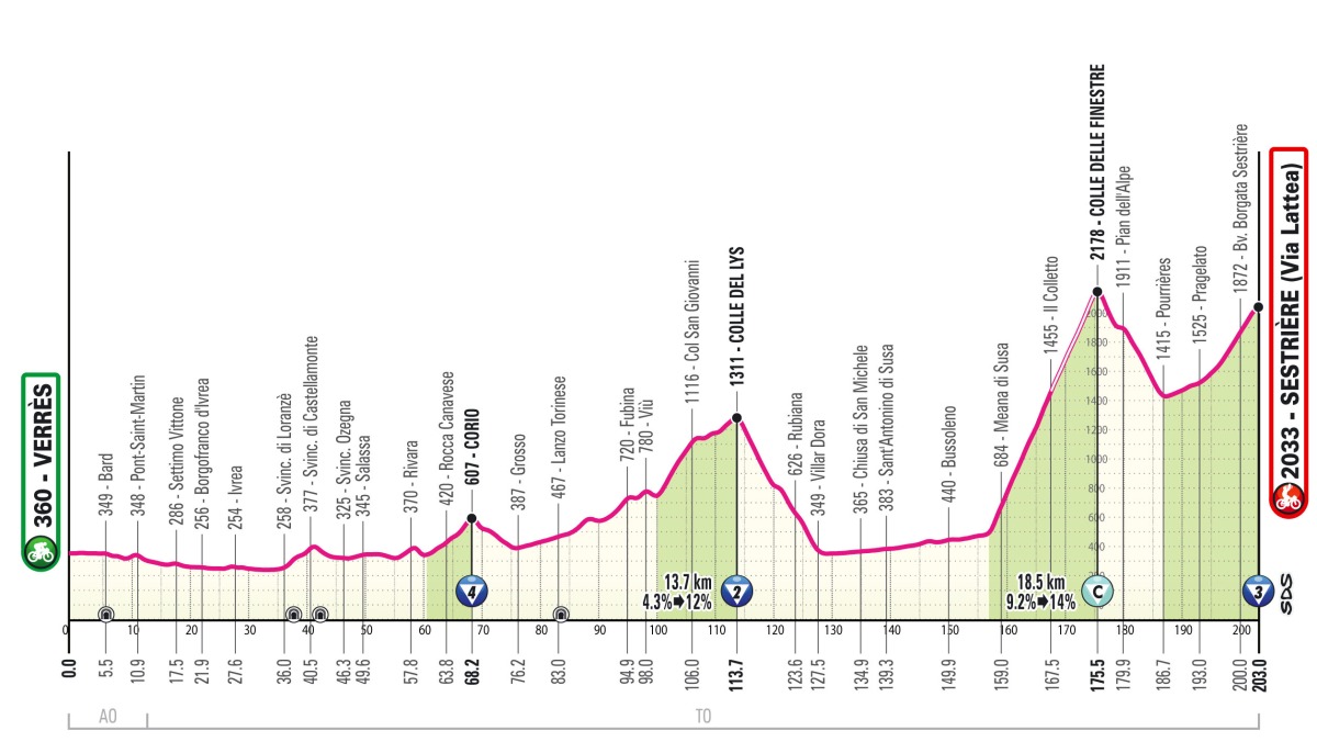 マリア・ローザをかけた最後の争いとなる第20ステージは、レース距離203kmで、獲得標高は4500m。2025年大会のチーマ・コッピ(最高標高地点)であるコッレ・デッレ・フィネストレは登坂距離18.5kmで、平均勾配9.2%。上っている間の緩急はそう大きくはないものの、頂上までの8kmから路面が一変し砂利道を走ることになる。ここを上り終えたらいったん下って、フィニッシュ地セストリエールに向かって最後の登坂。このステージを終えた時点でマリア・ローザに袖を通した選手が、大会制覇を実質決めることとなる。