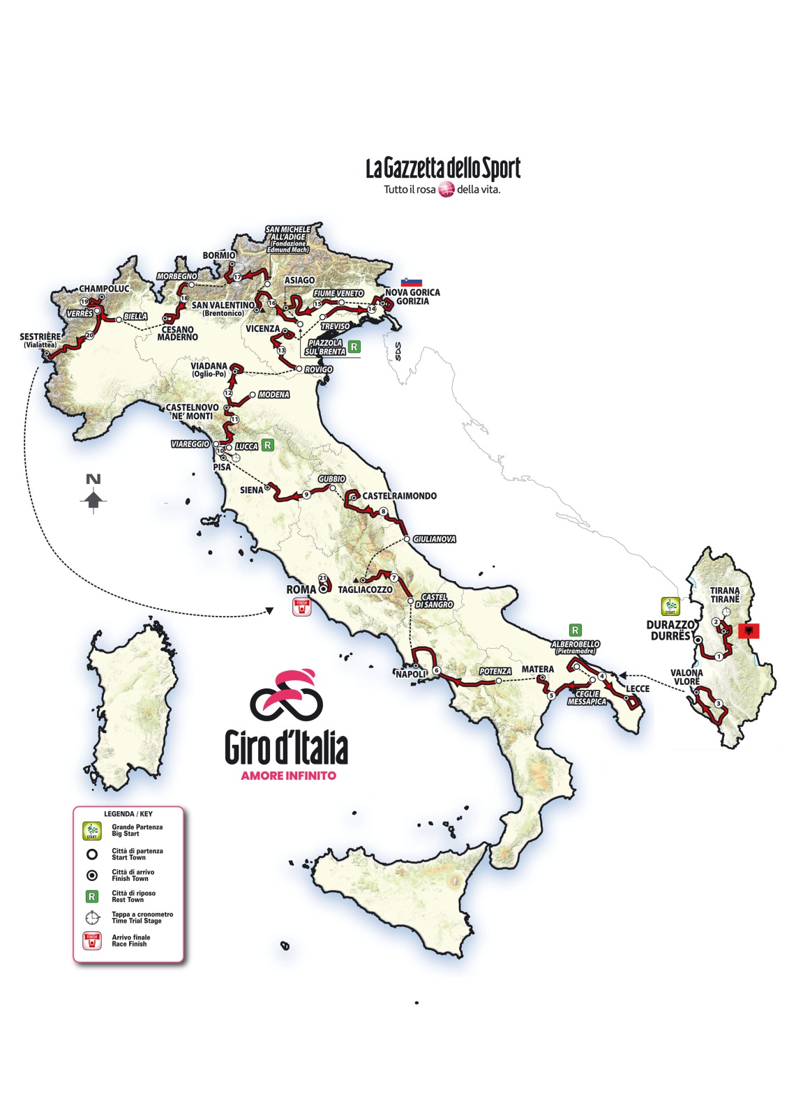 今回で108回目を迎えるジロは、5月9日(金)から6月1日(日)の日程で行われる。既報の通りアルバニアで3ステージを行い、5月12日(月)は移動日に充てられる。第4ステージ以降はイタリア国内を行き、途中でスロベニアにも足を運びながら最終目的地ローマへと向かっていく。全21ステージの総距離は3413km(大会開幕までにレース距離調整で総距離が多少変わることも想定される)で、ステージ平均距離としては162.5kmとなる。
