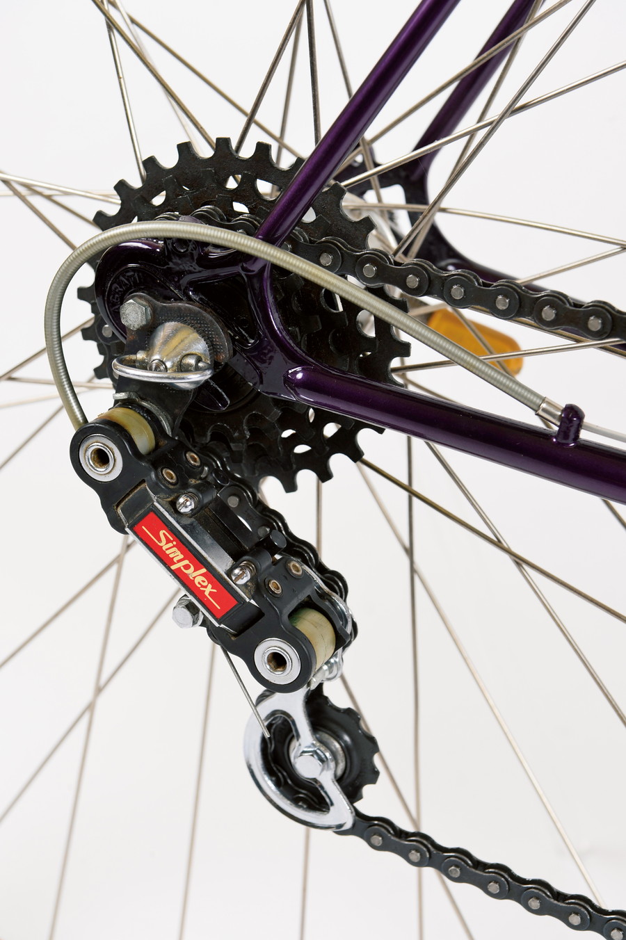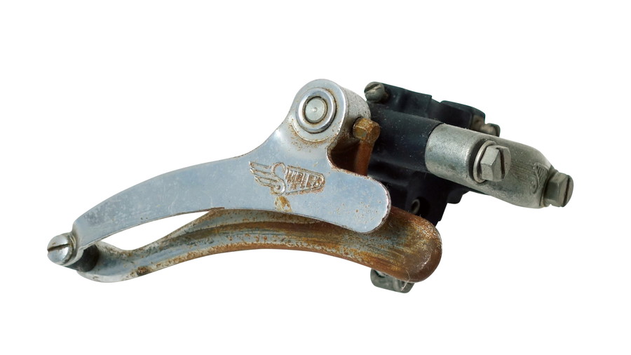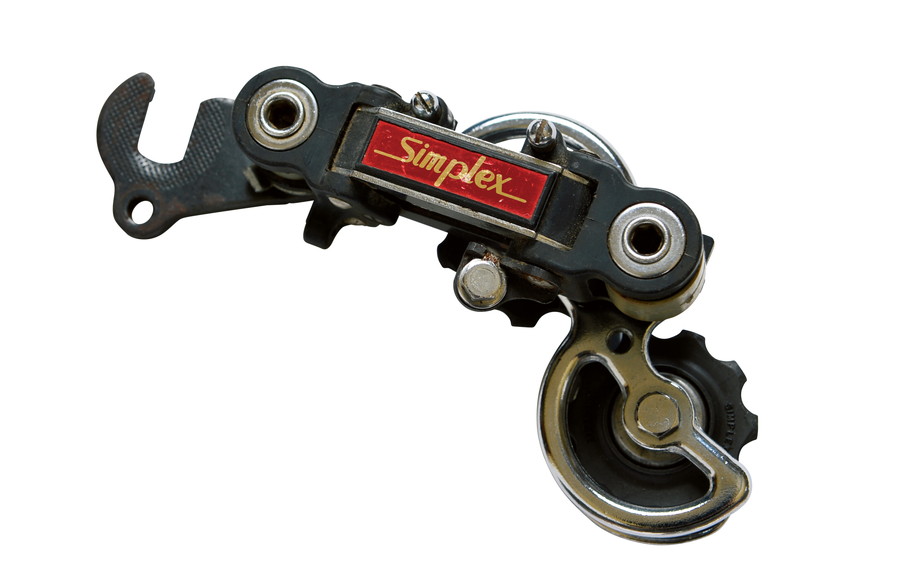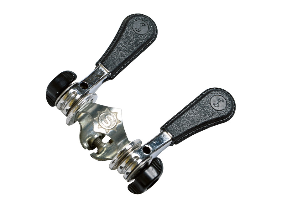 エロイカのレギュレーションの一つ、Wレバー。ダウンチューブでの変速は、手元シフターに慣れた人は「えっ」となる。サンプレックス・クリテリウムはプラカバーが付いた鉄製レバー。さほど人気もなく、フリマでも2~3千円くらいが相場と思われる。