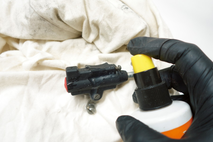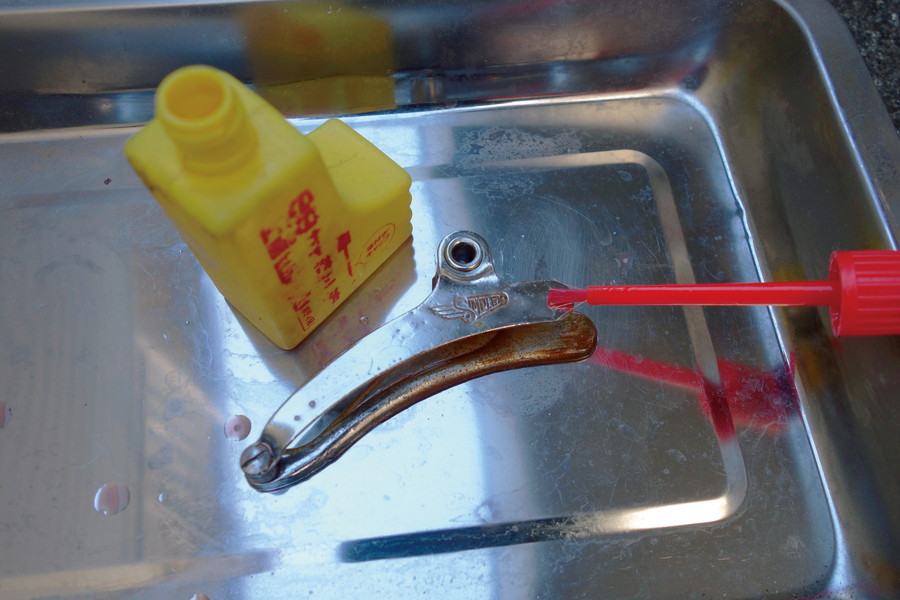 羽部分は、こちらもリン酸系サビ落としでサビ除去。サンプレのウィークポイント、デルリン樹脂(プラスチック)の粉を吹いたような部分には、クルマ系ケミカルのアーマーオールを散布してツヤ出し(&気休め)。