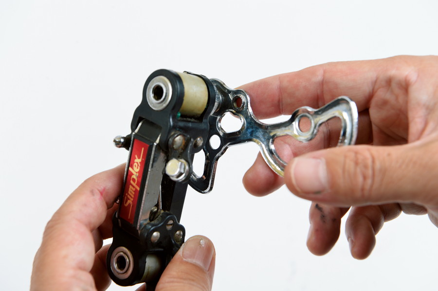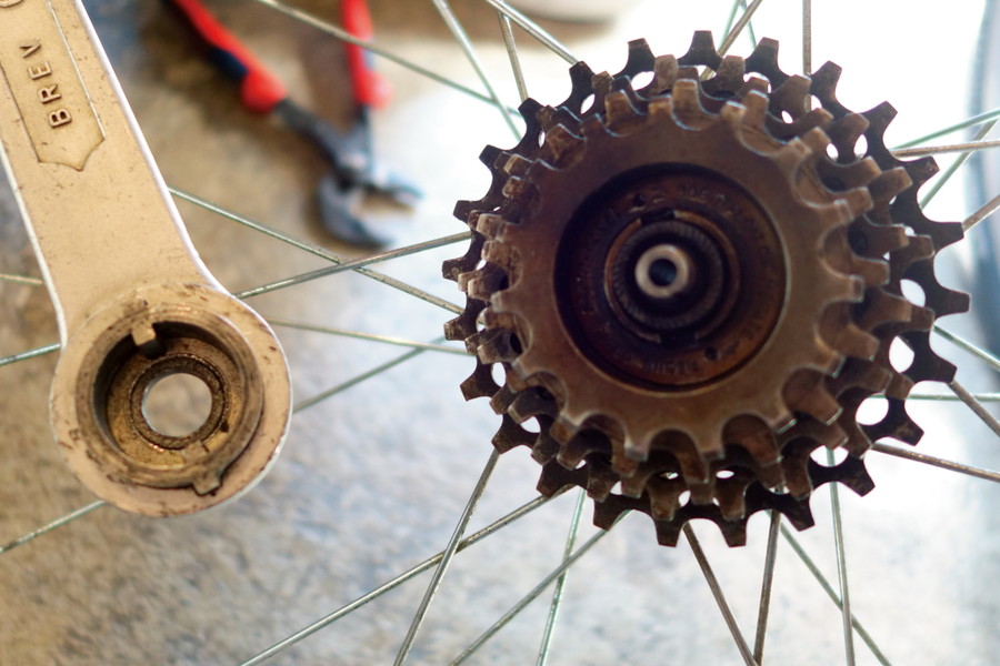 リン酸につけてサビを溶かし、ワイヤーブラシでこすり落とす。マファックのブレーキ取り付けボルトと、イケアの家具に使われていたナットでボルトを代用。ギヤ板の間に入れるスペーサーは真鍮パイプを切って自作した。