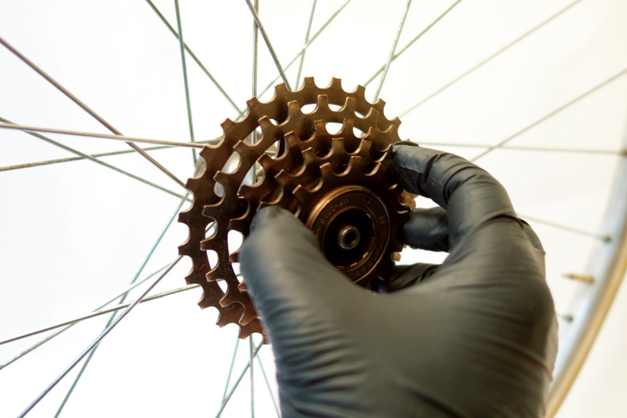 レジナのボスフリーが装着されていた。専用のフリー外しがないと爪を壊してしまうので、専門店「コルサコルサ」に依頼。14-28Tのワイドなシマノ5段フリーに交換。シンガポール製で、さほど古いものではない汎用品だ。