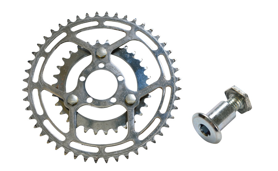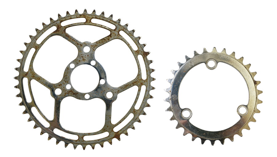 山の多い環境にも対応したフレンチランドナー系のヴィンテージパーツで行くことにする。サビサビのサンプレックスの48T鉄板チェーンリング(左)を入手。これに小さめのインナーリングを付ける。結構探して、30Tのインナーリング(右)を見付けた。これなら激坂に対応できる。ただし2枚のギヤ板どうしを留めるボルトがない。ボルトだけを別に入手するのは、かなり困難とか。