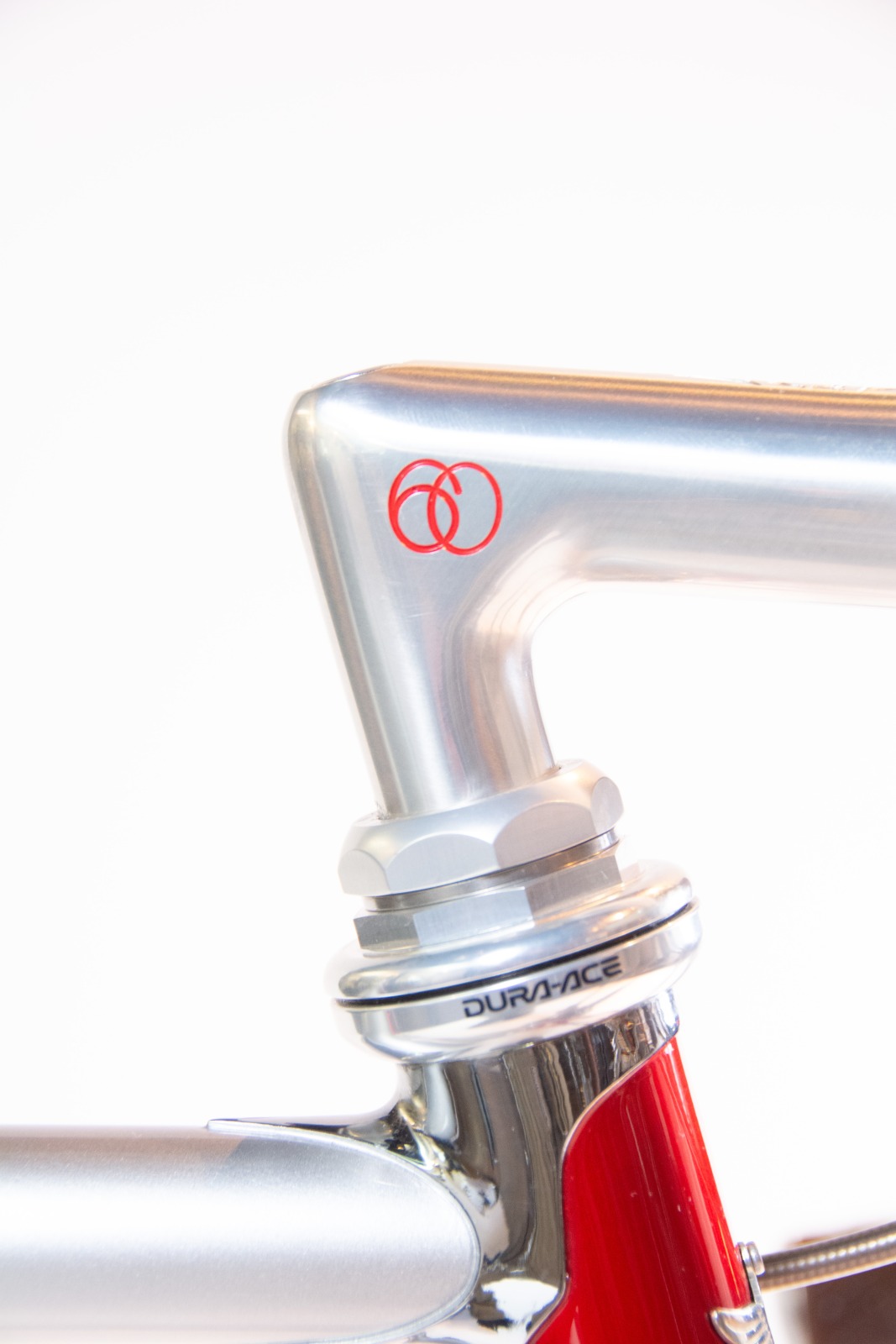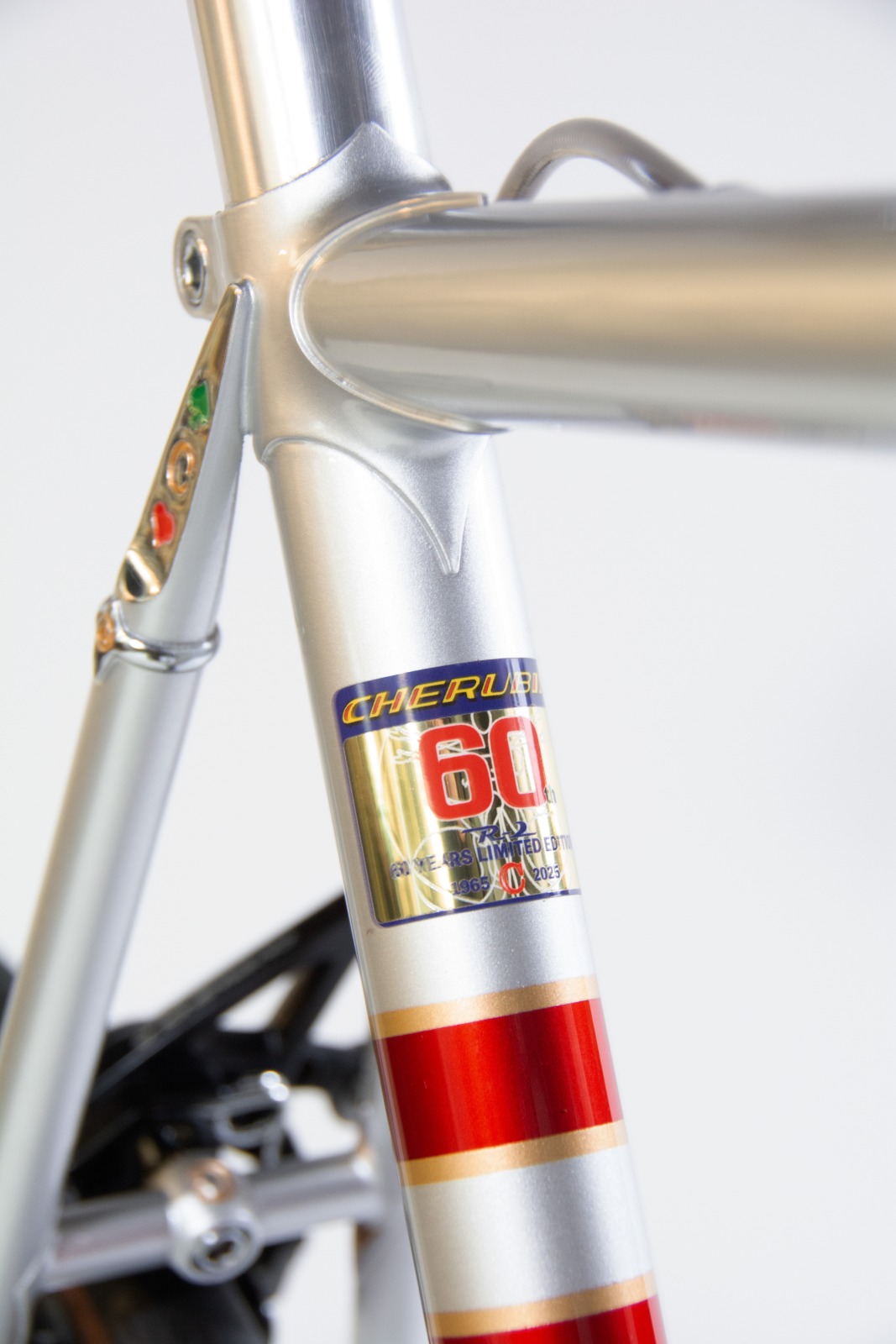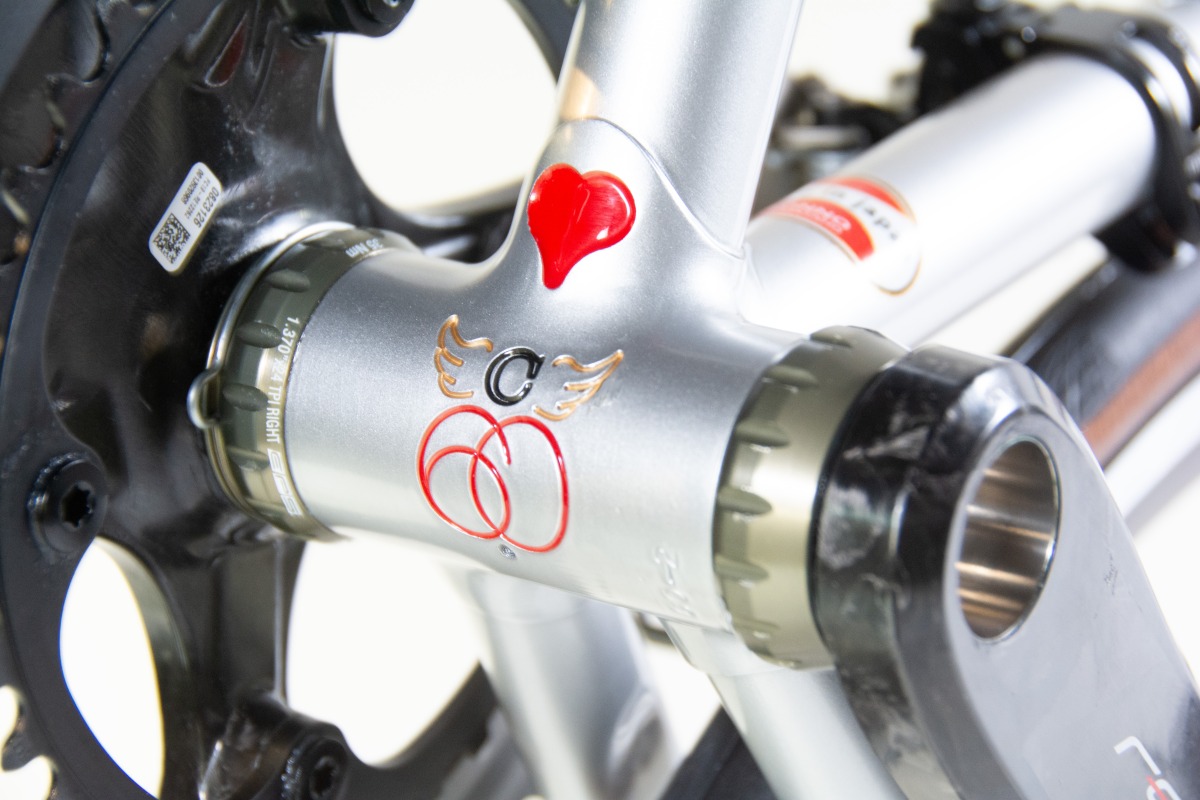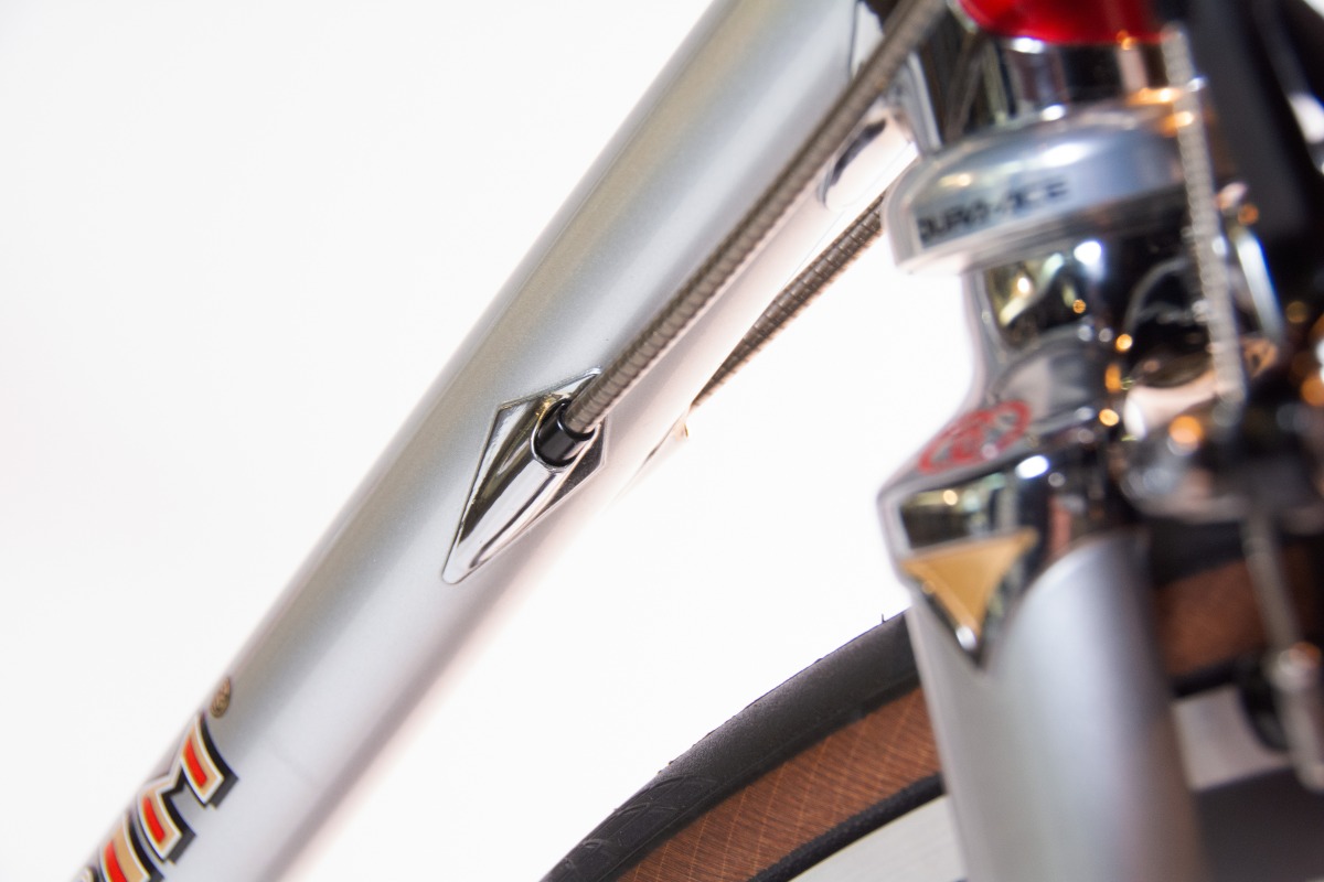 フレームには「KAISEI TUBE」製クロモリ鋼管を採用し、BB裏には60周年ロゴとシリアルナンバーを刻印。ブレーキ&シフトケーブルはフル内蔵設計を採用し、すっきりとした外観とメンテナンス性を両立。コンポーネントはカンパニョーロ・レコード、ホイールはゾンダ、タイヤはコンチネンタル GP5000を搭載し、レトロな外観ながら現代的な走行性能を実現した。日東製のステムとシートポストには60周年記念彫刻を施し、特別感を強調している。