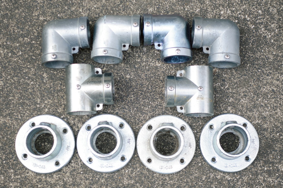 単管ジョイントたち。こうした鋳造やダイキャストのものはやや値が張る。足場に使う無骨なプレス製のものでもポートを作れるが、工事現場っぽくなっちゃうのは避けたいところ。逆に現場でこういう金具を使うことはなく、以前は店頭ではレアだった。最近は単管パイプで自作するニーズも増えてきて、容易に入手できるように