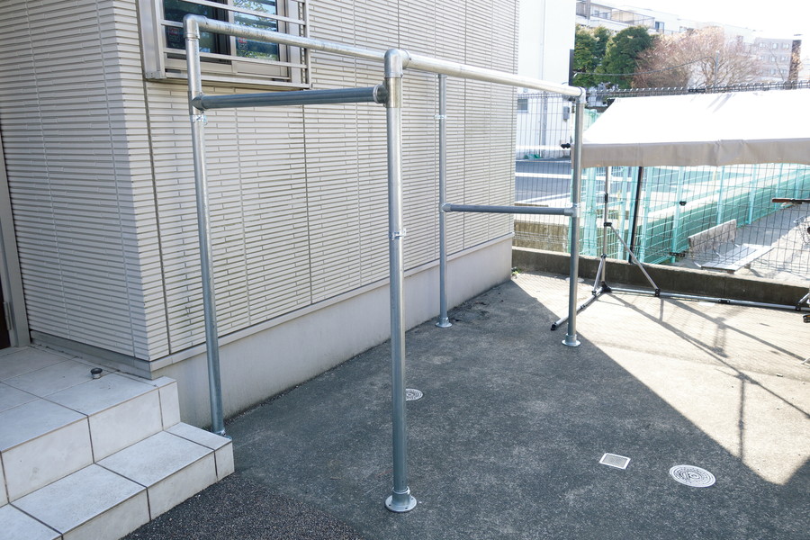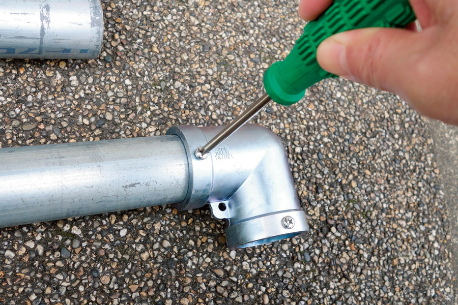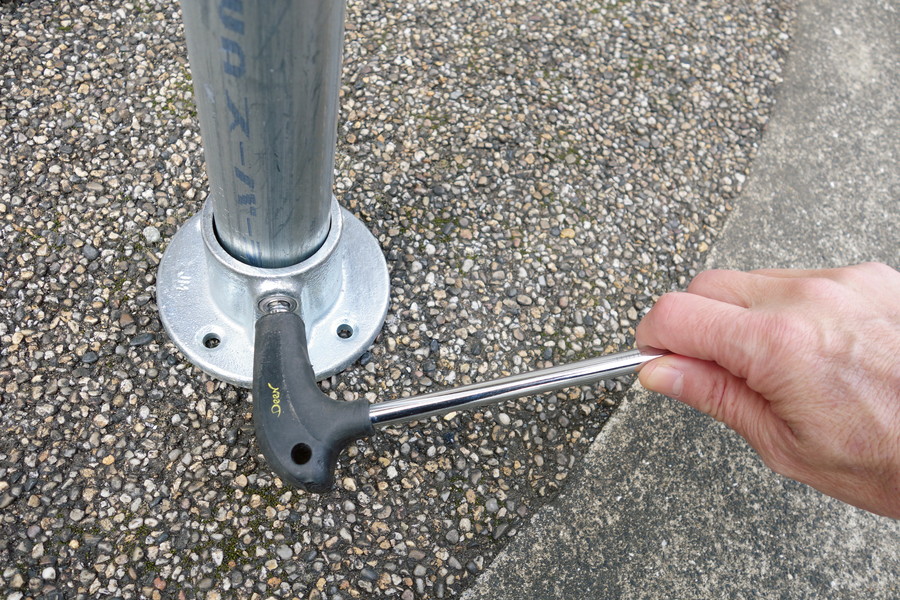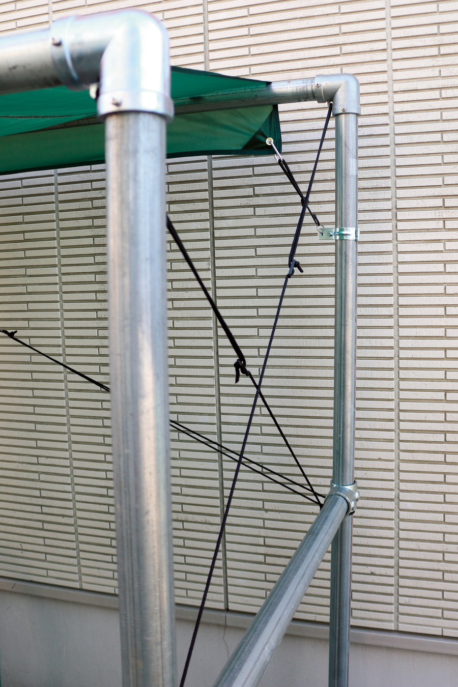 材料さえそろえば、組むのはあっという間。骨組みは15分でできた。ただ単管パイプは重いので、一人で支えるのはキツい場面も。こんな重いポートが飛んでしまうのだから台風の威力は恐ろしい。今回はベースをコンクリートネジで固定。これでポートの骨組みが完成する