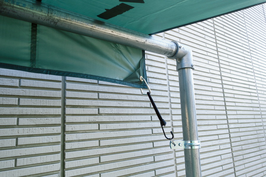 台風がきたり風が強くなってきたら、タープを外してしまう。カンタンに着脱できるし、フックで止めるだけなので、傷んだときの交換も楽々。180cm幅の防水シートは百均にもある