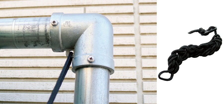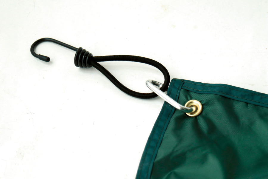 立てカンバンドのもう一つの穴にリングを付けておき、ストレッチコードのフックをひっかける。これでタープをカンタン固定