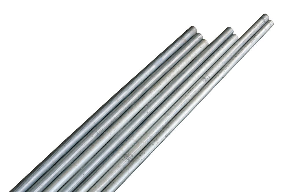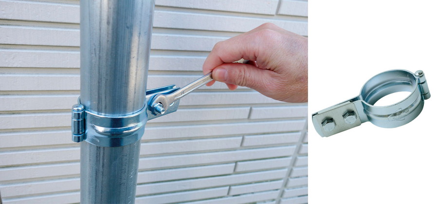 立てカンバンド、151円。雨樋などの塩ビパイプを固定するための金具。サイズ40Aが単管パイプの太さにフィット