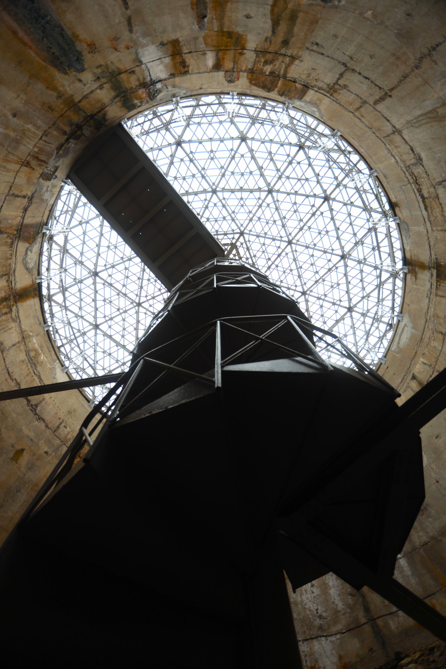 崖の上に白いドームが見えてくると、丹賀砲台園地だ。岩の中の要塞へ入り、傾斜リフトで上っていく。かつて暴発事故があったという悲劇の砲塔井まで上るとフォトジェニックで幻想的な風景が広がる。冷たい空気が漂う砲塔井を螺旋階段で上っていくと次第に外気の暑さを感じる。そしてかつて砲塔があった、豊後水道や大島などリアス海岸が見渡せる高台にたどり着いた。