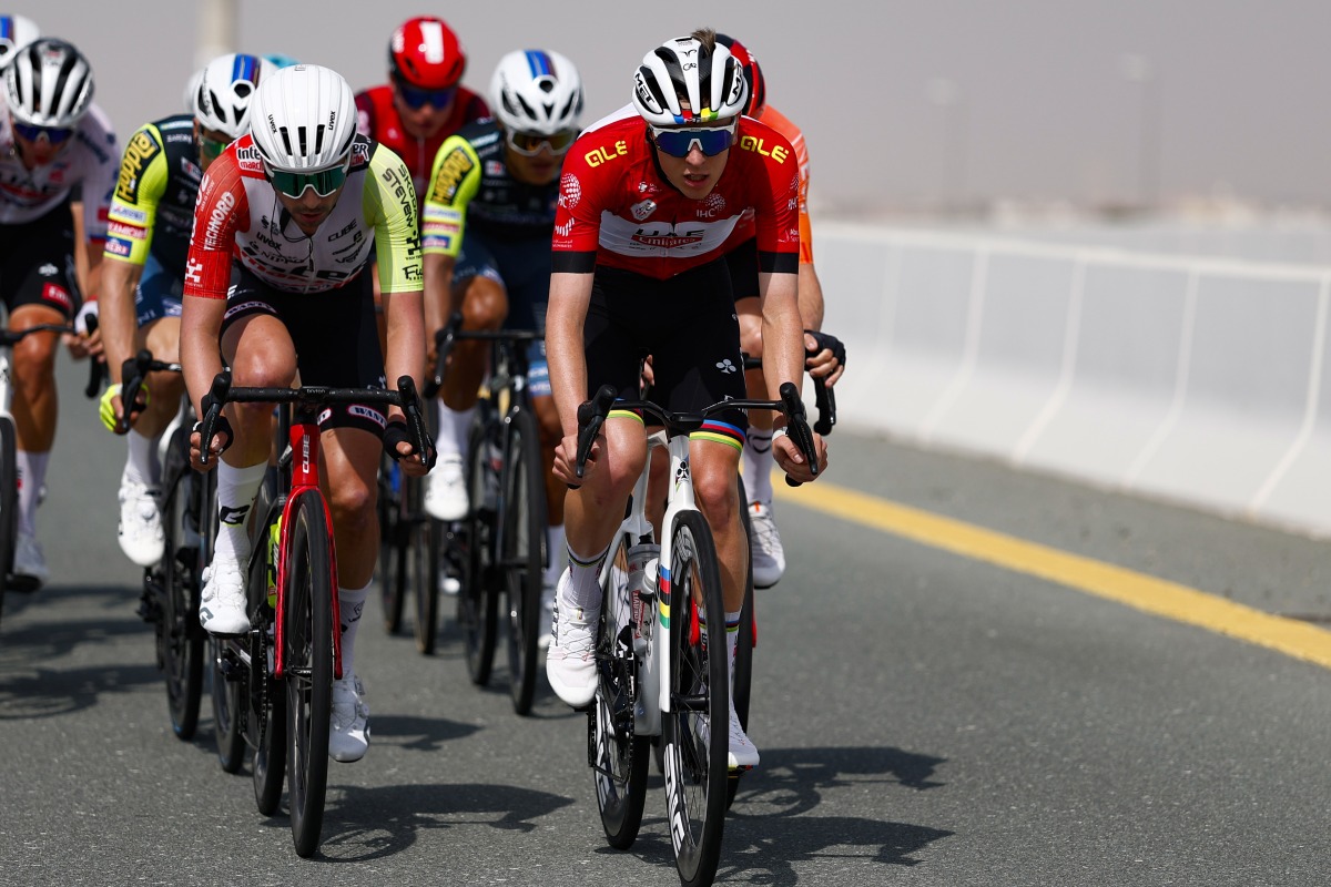 このステージでは、チームメートのルネ・ヘレホーツとフロリアン・フェルミールスの両ベルギー人ライダーが機能。クラシックレースで鍛えた脚は中東レース特有の「風」にきっちり対処し、ポガチャルが戦える態勢を整えた。ジュベル・ハフィートの中腹まで集団牽引を担うと、彼らが役目を終えた残り7.8kmで真打ちポガチャルが満を持してアタック。